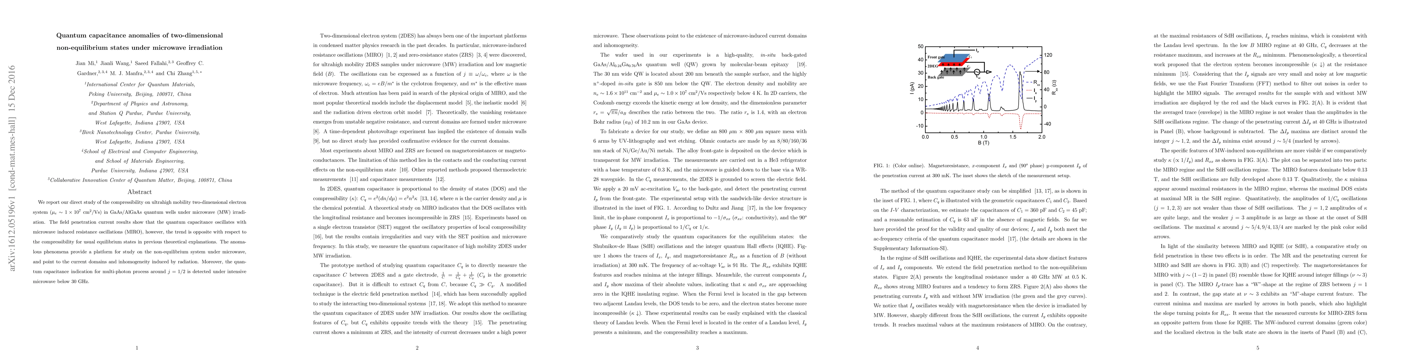 Researchers investigated how microwave irradiation affects a two-dimensional electron system in GaAs/AlGaAs quantum wells, finding anomalies in quantum capacitance that deviate from expected behavior, revealing the impact of radiation on current domains and inhomogeneity.