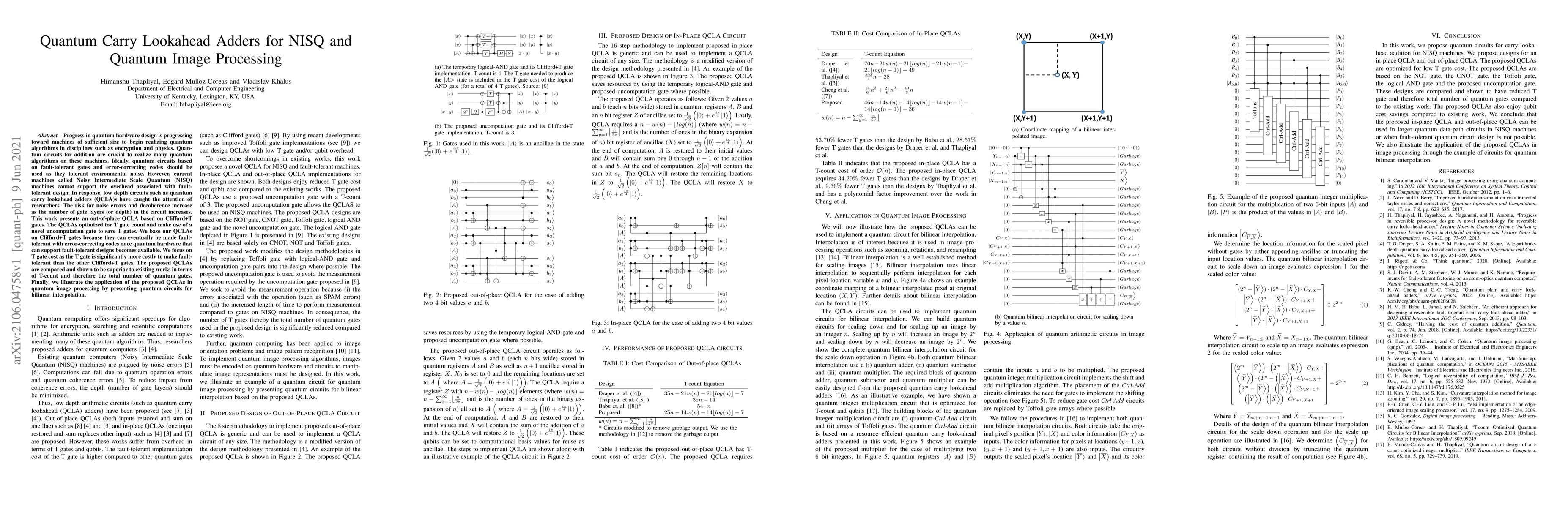 Progress in quantum hardware design is progressing toward machines of sufficient size to begin realizing quantum algorithms in disciplines such as encryption and physics. Quantum circuits for addition are crucial to realize many quantum algorithms on these machines. Ideally, quantum circuits based on fault-tolerant gates and error-correcting codes should be used as they tolerant environmental noise. However, current machines called Noisy Intermediate Scale Quantum (NISQ) machines cannot support the overhead associated with faulttolerant design. In response, low depth circuits such as quantum carry lookahead adders (QCLA)s have caught the attention of researchers. The risk for noise errors and decoherence increase as the number of gate layers (or depth) in the circuit increases. This work presents an out-of-place QCLA based on Clifford+T gates. The QCLAs optimized for T gate count and make use of a novel uncomputation gate to save T gates. We base our QCLAs on Clifford+T gates because they can eventually be made faulttolerant with error-correcting codes once quantum hardware that can support fault-tolerant designs becomes available. We focus on T gate cost as the T gate is significantly more costly to make faulttolerant than the other Clifford+T gates. The proposed QCLAs are compared and shown to be superior to existing works in terms of T-count and therefore the total number of quantum gates. Finally, we illustrate the application of the proposed QCLAs in quantum image processing by presenting quantum circuits for bilinear interpolation.