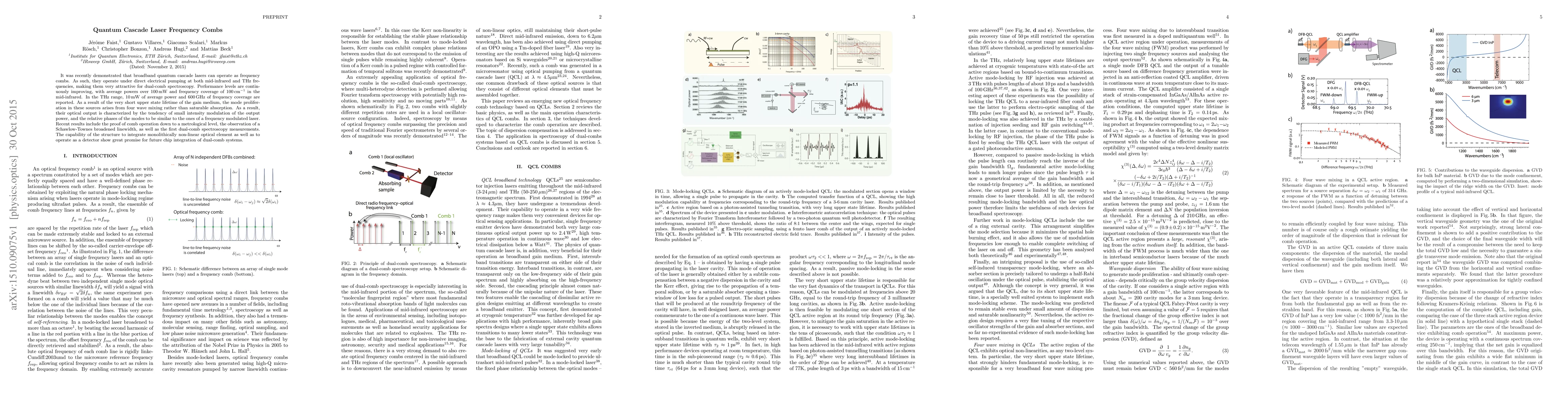 Quantum cascade lasers functioning as frequency combs provide broadband sources for spectroscopy, achieving over 100 mW average power at mid-infrared and 10 mW at THz frequencies, with significant frequency coverage. Their mode proliferation results from four-wave mixing, enabling advanced dual-comb spectroscopy and potential monolithic integration of optical elements.