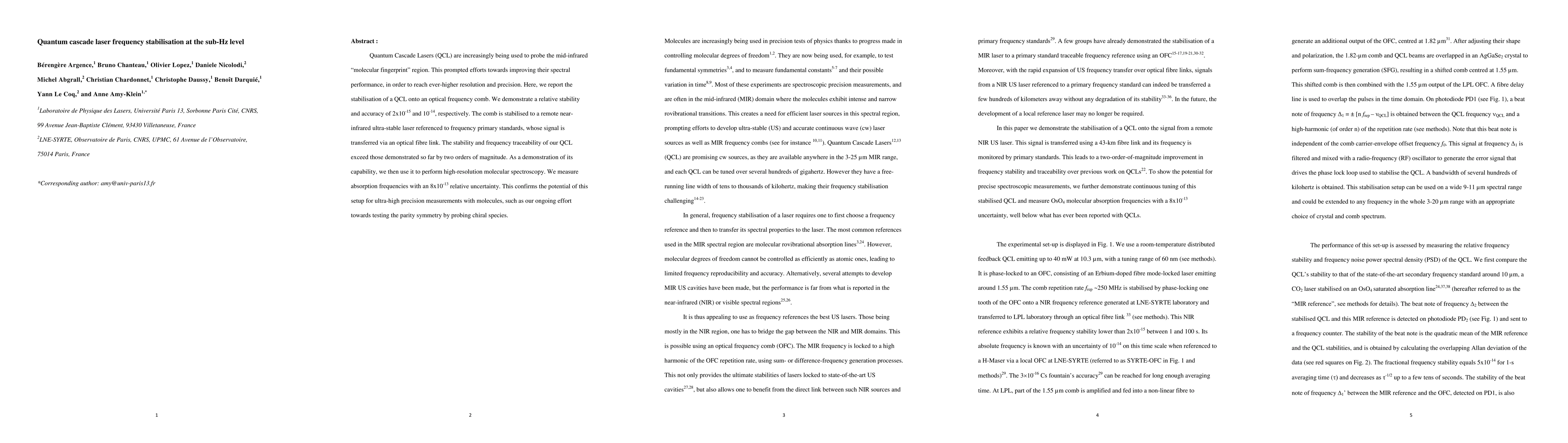 Quantum Cascade Lasers (QCL) are increasingly being used to probe the mid-infrared "molecular fingerprint" region. This prompted efforts towards improving their spectral performance, in order to reach ever-higher resolution and precision. Here, we report the stabilisation of a QCL onto an optical frequency comb. We demonstrate a relative stability and accuracy of 2x10-15 and 10-14, respectively. The comb is stabilised to a remote near-infrared ultra-stable laser referenced to frequency primary standards, whose signal is transferred via an optical fibre link. The stability and frequency traceability of our QCL exceed those demonstrated so far by two orders of magnitude. As a demonstration of its capability, we then use it to perform high-resolution molecular spectroscopy. We measure absorption frequencies with an 8x10-13 relative uncertainty. This confirms the potential of this setup for ultra-high precision measurements with molecules, such as our ongoing effort towards testing the parity symmetry by probing chiral species.