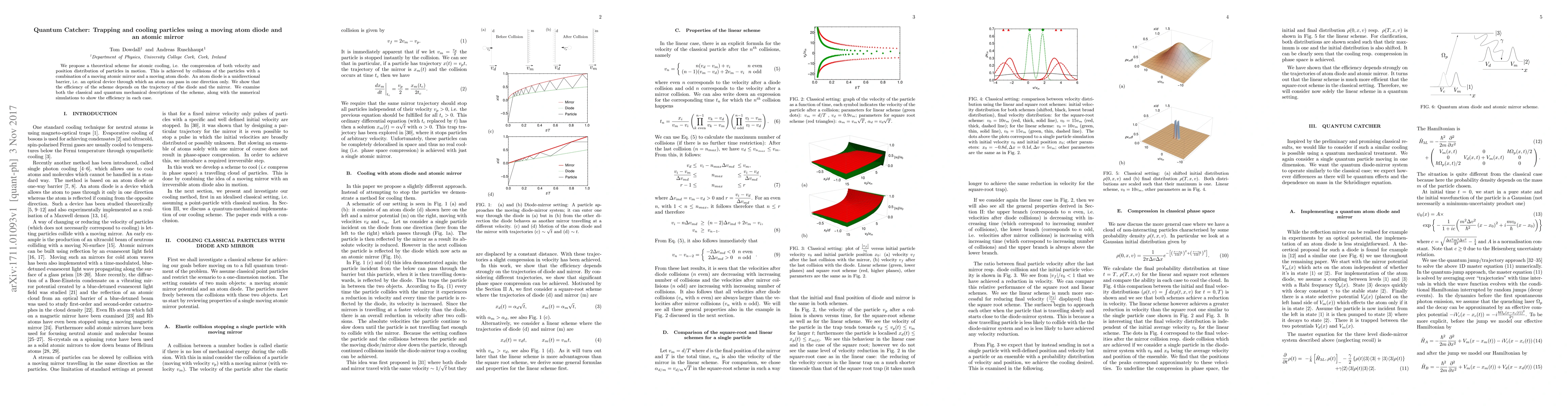We propose a theoretical scheme for atomic cooling, i.e. the compression of both velocity and position distribution of particles in motion. This is achieved by collisions of the particles with a combination of a moving atomic mirror and a moving atom diode. An atom diode is a unidirectional barrier, i.e. an optical device through which an atom can pass in one direction only. We show that the efficiency of the scheme depends on the trajectory of the diode and the mirror. We examine both the classical and quantum mechanical descriptions of the scheme, along with the numerical simulations to show the efficiency in each case.