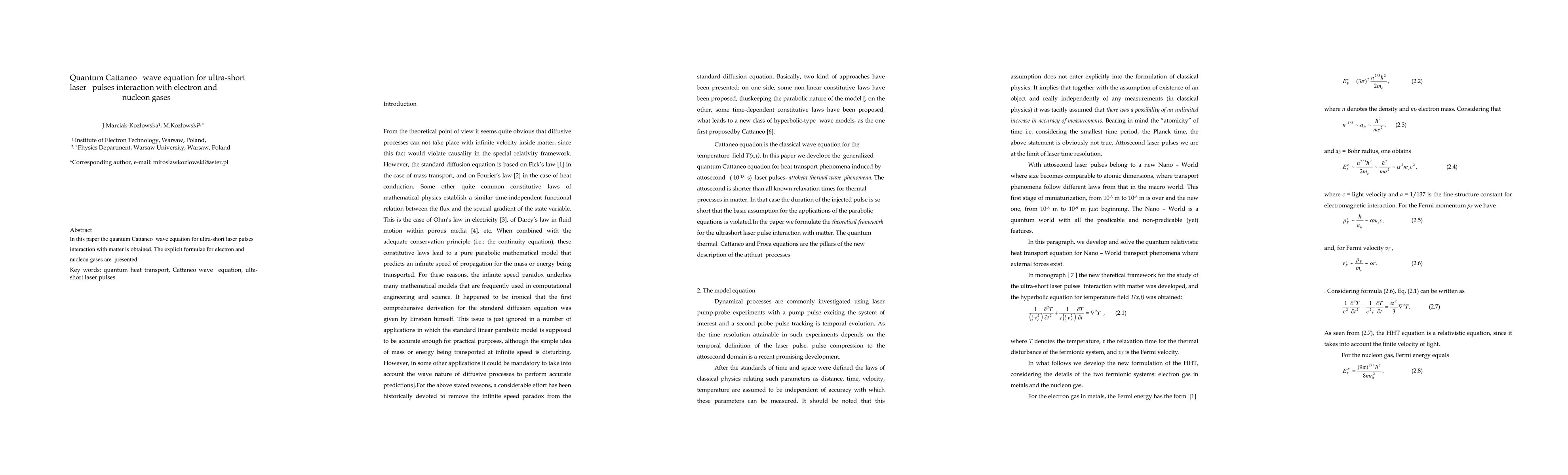 Summary: This paper derives the quantum Cattaneo wave equation for ultra-short laser pulses interacting with electron and nucleon gases, providing explicit formulae for these interactions. The study focuses on the quantum dynamics of such interactions in medium.