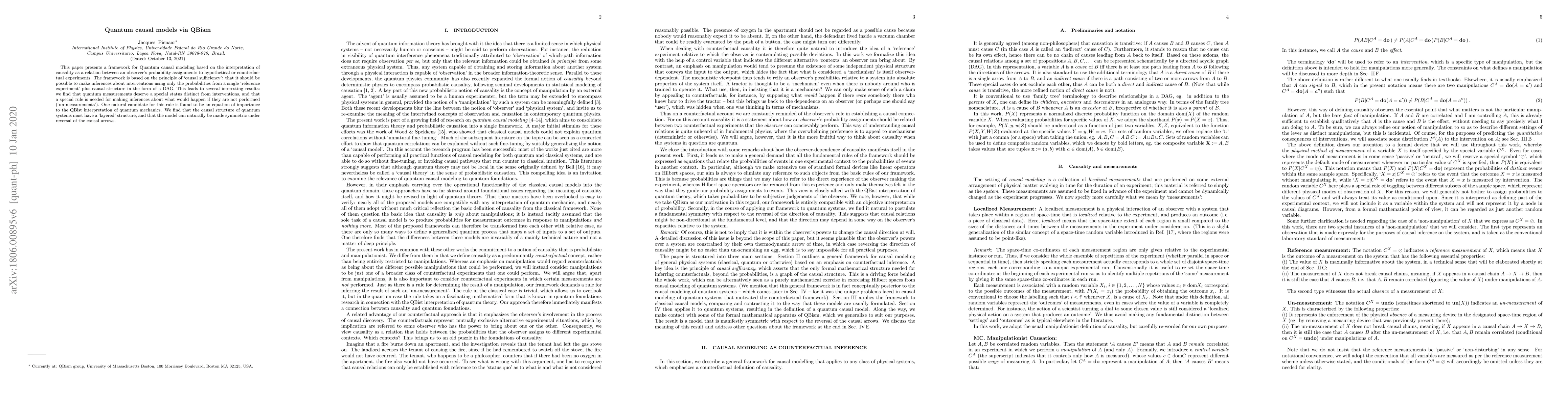 This paper presents a framework for Quantum causal modeling based on the interpretation of causality as a relation between an observer's probability assignments to hypothetical or counterfactual experiments. The framework is based on the principle of `causal sufficiency': that it should be possible to make inferences about interventions using only the probabilities from a single `reference experiment' plus causal structure in the form of a DAG. This leads to several interesting results: we find that quantum measurements deserve a special status distinct from interventions, and that a special rule is needed for making inferences about what would happen if they are not performed (`un-measurements'). One natural candidate for this rule is found to be an equation of importance to the QBist interpretation of quantum mechanics. We find that the causal structure of quantum systems must have a `layered' structure, and that the model can naturally be made symmetric under reversal of the causal arrows.