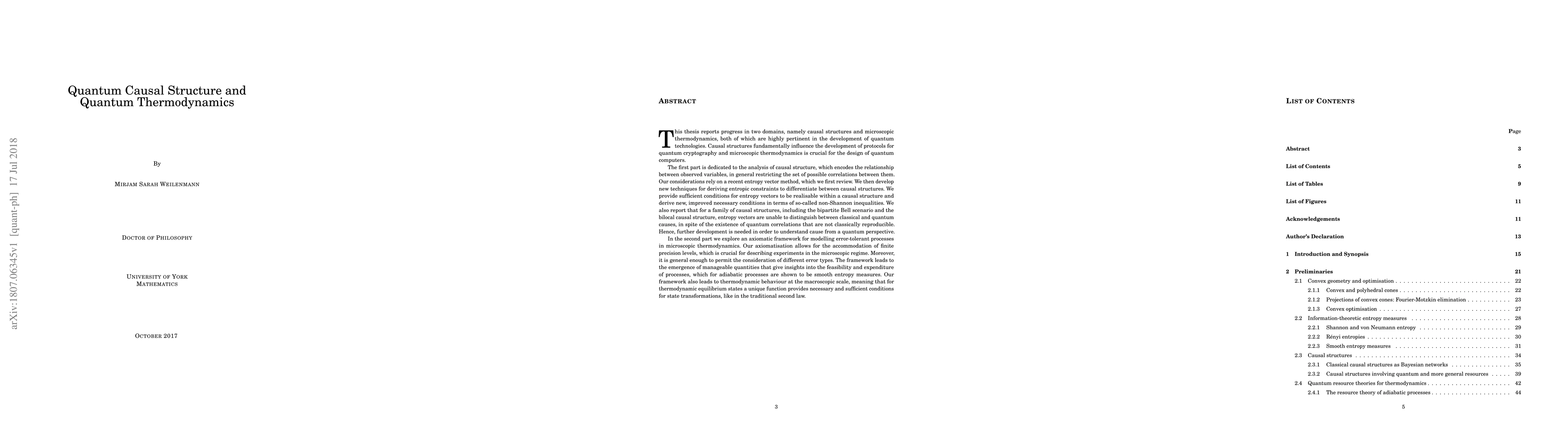 This thesis reports progress in two domains, causal structures and microscopic thermodynamics, both of which are pertinent in the development of quantum technologies. The first part is dedicated to the analysis of causal structure, which encodes the relationship between observed variables, in general restricting the set of possible correlations between them. Our considerations rely on a recent entropy vector method. Based on this, we develop techniques for deriving entropic constraints to differentiate between causal structures. We provide sufficient conditions for entropy vectors to be realisable within a causal structure and derive new, improved necessary conditions in terms of so-called non-Shannon inequalities. We also report that for a family of causal structures, including the bipartite Bell scenario and the bilocal causal structure, entropy vectors are unable to distinguish between classical and quantum causes, in spite of the existence of quantum correlations that are not classically reproducible. Hence, further development is needed in order to understand cause from a quantum perspective. In the second part we explore an axiomatic framework for modelling error-tolerant processes in microscopic thermodynamics. Our axiomatisation allows for the accommodation of finite precision levels, crucial for describing experiments in the microscopic regime. It leads to the emergence of manageable quantities that give insights into the feasibility and expenditure of processes, which for adiabatic processes are shown to be smooth entropy measures. Our framework also leads to thermodynamic behaviour at the macroscopic scale, meaning that for thermodynamic equilibrium states a unique function provides necessary and sufficient conditions for state transformations, like in the traditional second law.