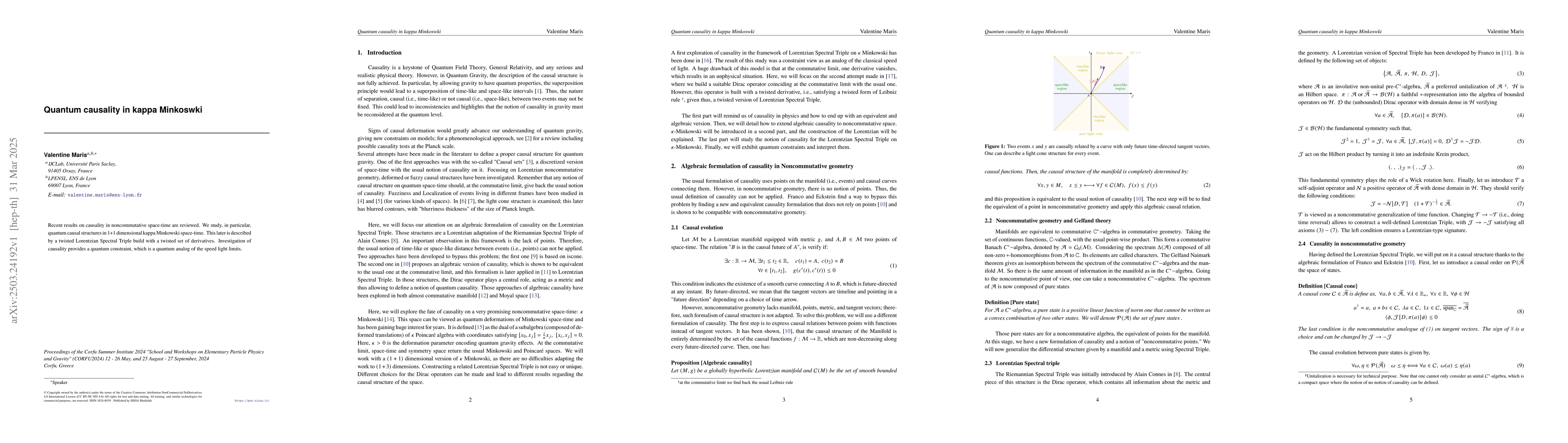 Recent results on causality in noncommutative space-time are reviewed. We study, in particular, quantum causal structures in 1+1 dimensional kappa Minkowski space-time. This later is described by a twisted Lorentzian Spectral Triple build with a twisted set of derivatives. Investigation of causality provides a quantum constraint, which is a quantum analog of the speed light limits