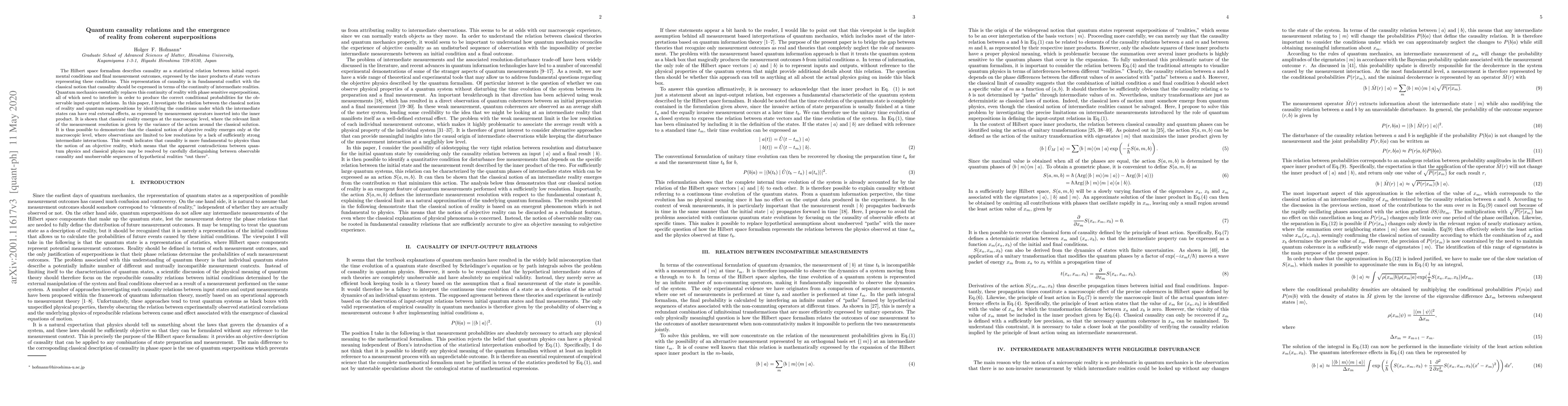The Hilbert space formalism describes causality as a statistical relation between initial experimental conditions and final measurement outcomes, expressed by the inner products of state vectors representing these conditions. This representation of causality is in fundamental conflict with the classical notion that causality should be expressed in terms of the continuity of intermediate realities. Quantum mechanics essentially replaces this continuity of reality with phase sensitive superpositions, all of which need to interfere in order to produce the correct conditional probabilities for the observable input-output relations. In this paper, I investigate the relation between the classical notion of reality and quantum superpositions by identifying the conditions under which the intermediate states can have real external effects, as expressed by measurement operators inserted into the inner product. It is shown that classical reality emerges at the macroscopic level, where the relevant limit of the measurement resolution is given by the variance of the action around the classical solution. It is thus possible to demonstrate that the classical notion of objective reality emerges only at the macroscopic level, where observations are limited to low resolutions by a lack of sufficiently strong intermediate interactions. This result indicates that causality is more fundamental to physics than the notion of an objective reality, which means that the apparent contradictions between quantum physics and classical physics may be resolved by carefully distinguishing between observable causality and unobservable sequences of hypothetical realities "out there".