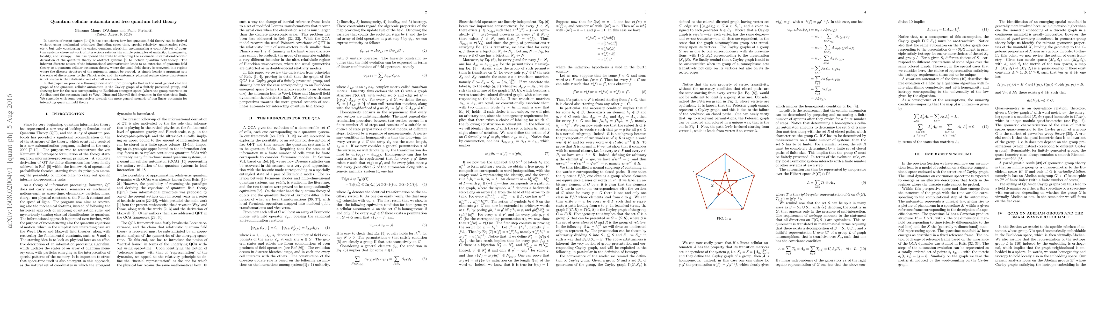 This paper derives free quantum field theory from the principles of quantum cellular automata, showing that the graph of the automaton is the Cayley graph of a finitely presented group. It demonstrates that in the relativistic limit, the automata reproduce Weyl, Dirac, and Maxwell field dynamics, and discusses the potential for extending this approach to non-linear automata for interacting quantum field theory.
