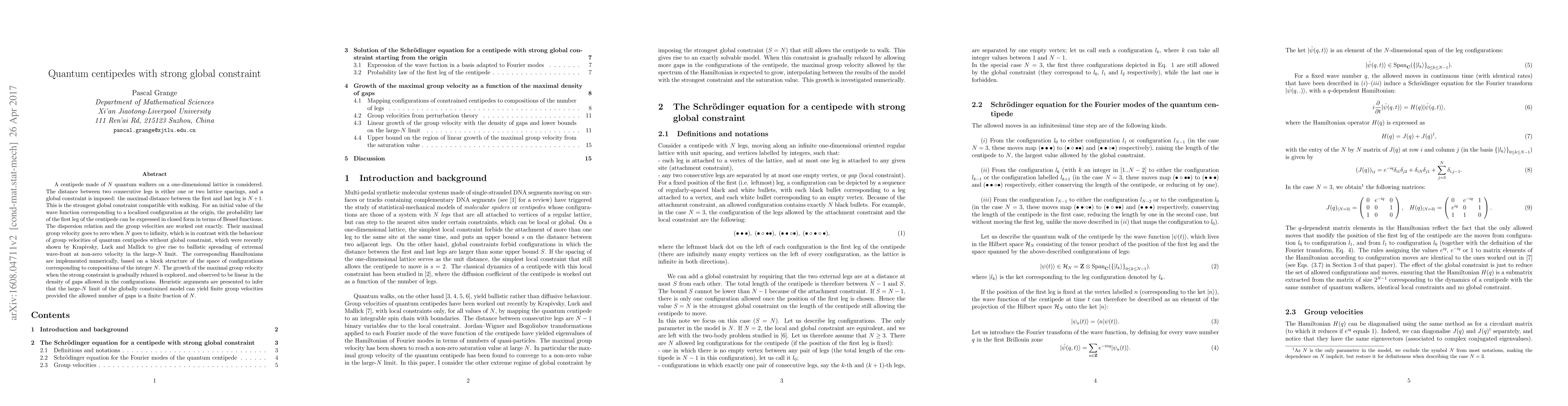 A centipede made of $N$ quantum walkers on a one-dimensional lattice is considered. The distance between two consecutive legs is either one or two lattice spacings, and a global constraint is imposed: the maximal distance between the first and last leg is $N+1$. This is the strongest global constraint compatible with walking. For an initial value of the wave function corresponding to a localized configuration at the origin, the probability law of the first leg of the centipede can be expressed in closed form in terms of Bessel functions. The dispersion relation and the group velocities are worked out exactly. Their maximal group velocity goes to zero when $N$ goes to infinity, which is in contrast with the behaviour of group velocities of quantum centipedes without global constraint, which were recently shown by Krapivsky, Luck and Mallick to give rise to ballistic spreading of extremal wave-front at non-zero velocity in the large-$N$ limit. The corresponding Hamiltonians are implemented numerically, based on a block structure of the space of configurations corresponding to compositions of the integer $N$. The growth of the maximal group velocity when the strong constraint is gradually relaxed is explored, and observed to be linear in the density of gaps allowed in the configurations. Heuristic arguments are presented to infer that the large-$N$ limit of the globally constrained model can yield finite group velocities provided the allowed number of gaps is a finite fraction of $N$.