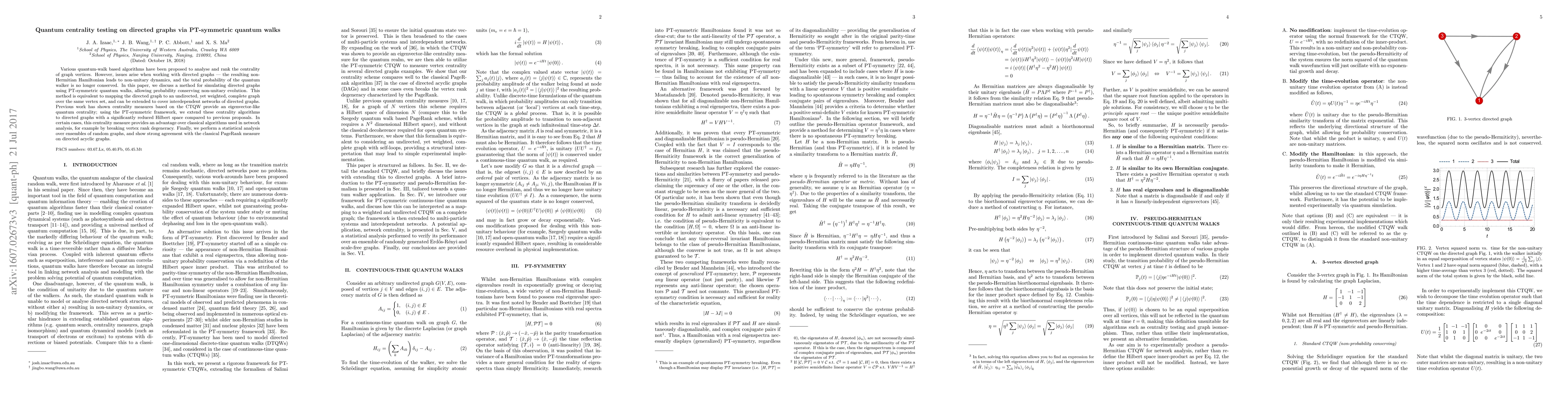 This paper proposes a method for analyzing centrality in directed graphs using PT-symmetric quantum walks, which conserves probability and allows for reduced Hilbert space compared to previous methods. The approach shows advantages over classical network analysis algorithms, particularly in breaking vertex rank degeneracy.