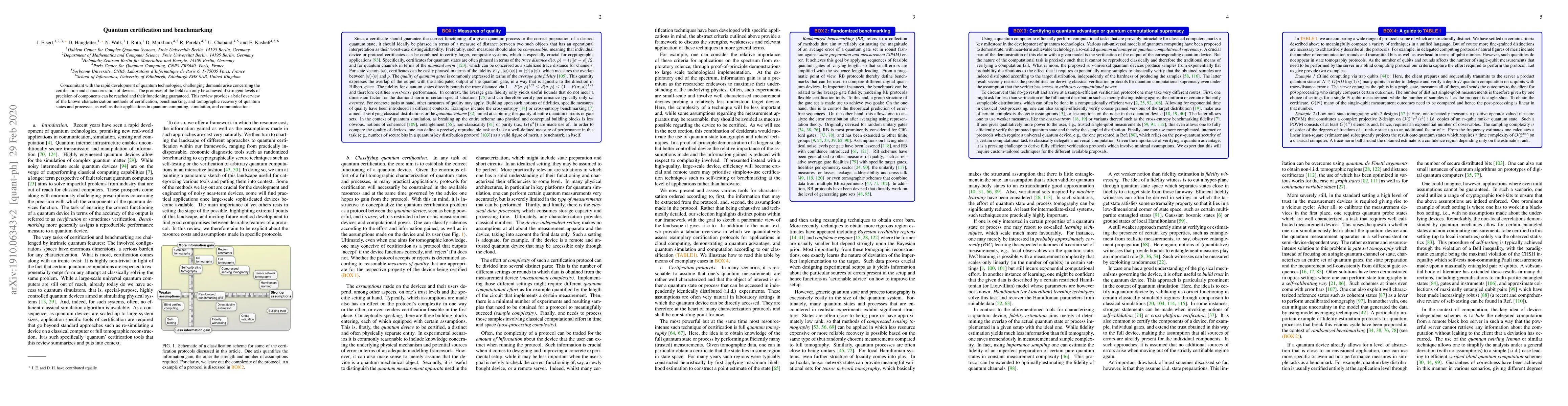 Concomitant with the rapid development of quantum technologies, challenging demands arise concerning the certification and characterization of devices. The promises of the field can only be achieved if stringent levels of precision of components can be reached and their functioning guaranteed. This review provides a brief overview of the known characterization methods of certification, benchmarking, and tomographic recovery of quantum states and processes, as well as their applications in quantum computing, simulation, and communication.