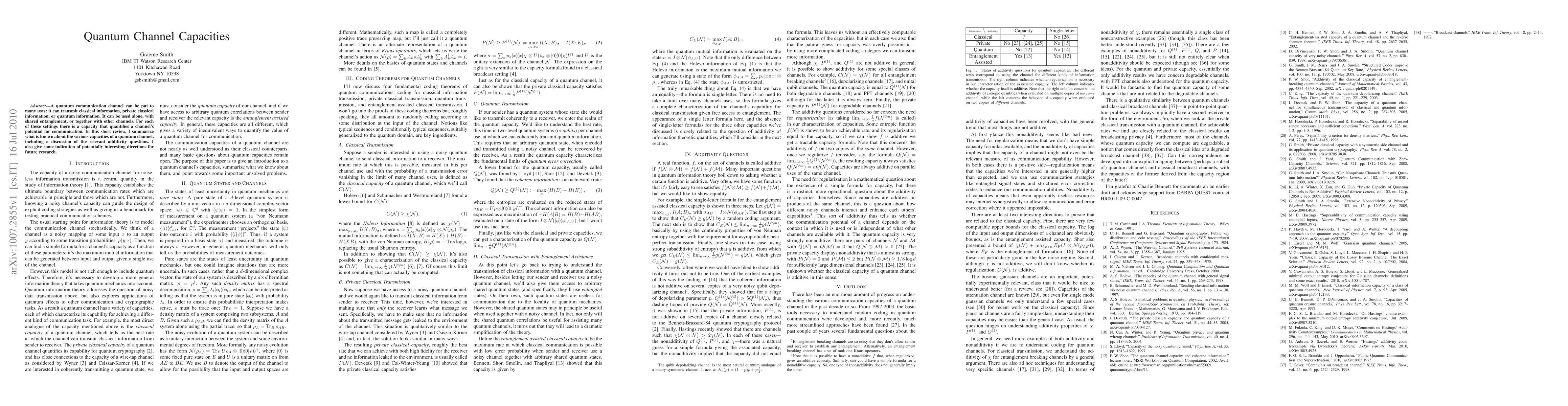 This paper reviews the various capacities of quantum communication channels, detailing their potential for transmitting classical and quantum information, and discusses the ongoing additivity questions. It also highlights promising future research directions in this field.