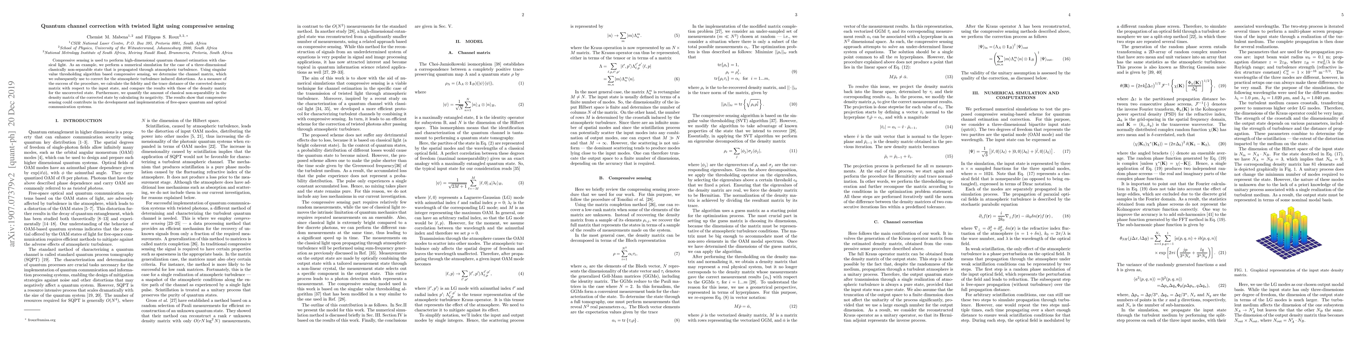 This paper uses compressive sensing to estimate and correct quantum channel distortions caused by atmospheric turbulence, demonstrating the technique through a numerical simulation of a three-dimensional non-separable state. The study shows that the method can effectively restore the fidelity and classical non-separability of the quantum state, suggesting its potential for quantum communication systems.
