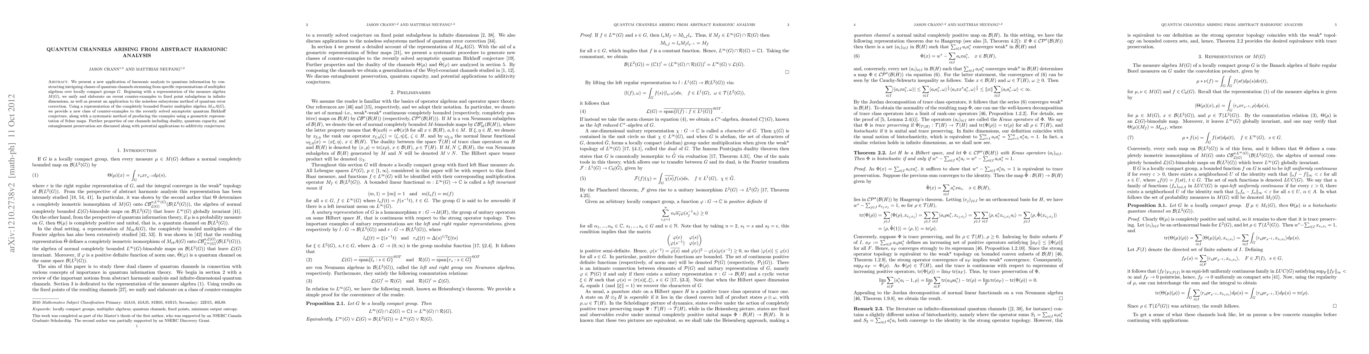 The paper introduces a novel approach to constructing quantum channels via abstract harmonic analysis, specifically through representations of multiplier algebras over locally compact groups, leading to new classes of counter-examples relevant to quantum information theory.