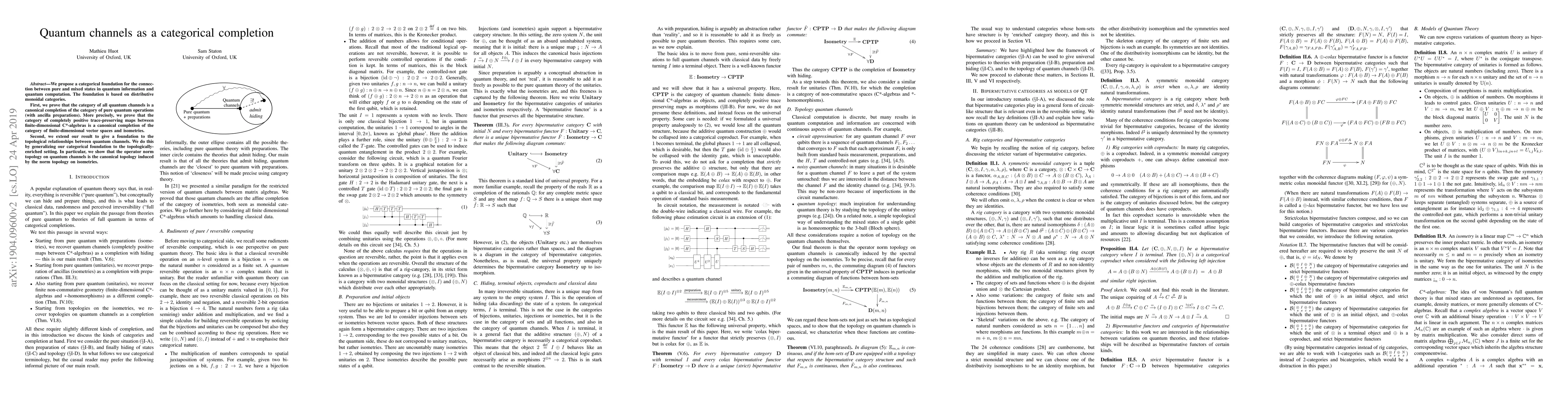 We propose a categorical foundation for the connection between pure and mixed states in quantum information and quantum computation. The foundation is based on distributive monoidal categories. First, we prove that the category of all quantum channels is a canonical completion of the category of pure quantum operations (with ancilla preparations). More precisely, we prove that the category of completely positive trace-preserving maps between finite-dimensional C*-algebras is a canonical completion of the category of finite-dimensional vector spaces and isometries. Second, we extend our result to give a foundation to the topological relationships between quantum channels. We do this by generalizing our categorical foundation to the topologically-enriched setting. In particular, we show that the operator norm topology on quantum channels is the canonical topology induced by the norm topology on isometries.
