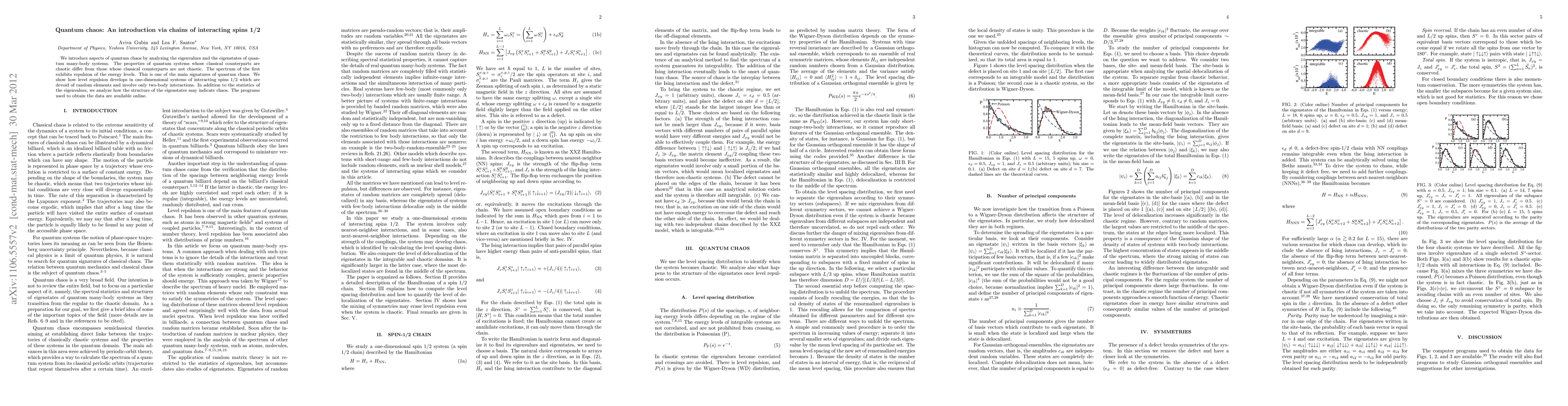 This paper explores quantum chaos through the analysis of eigenvalues and eigenstates in many-body systems, highlighting that quantum systems with chaotic classical counterparts exhibit level repulsion, a key signature of quantum chaos. It demonstrates this in one-dimensional spin-1/2 chains, revealing how the structure of eigenstates can indicate chaos, with data analysis tools available online.