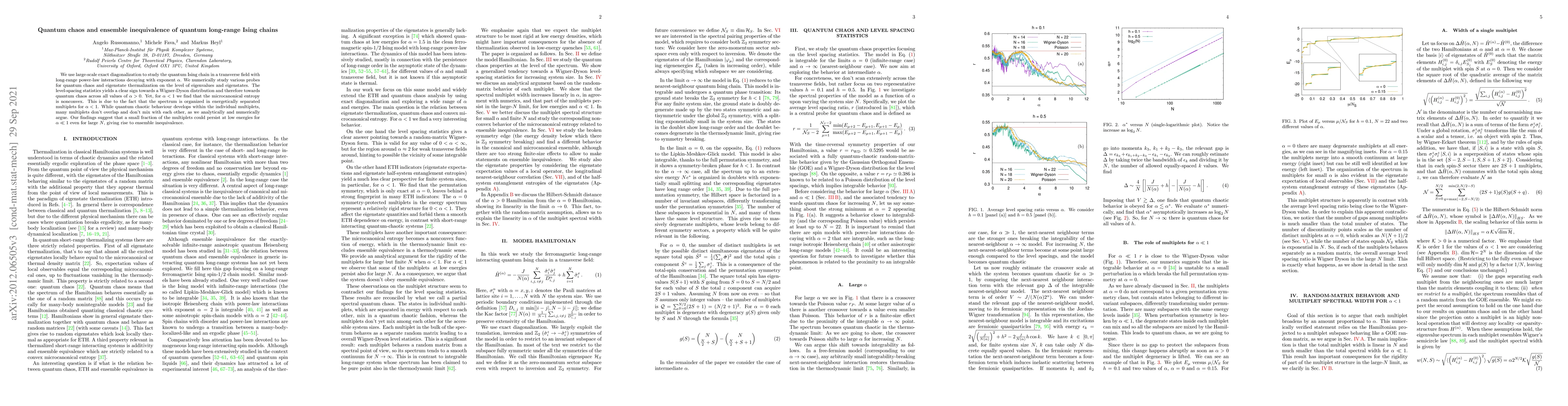 This paper investigates quantum chaos and ensemble inequivalence in long-range Ising chains using exact diagonalization. It finds quantum chaos across all interaction strengths but identifies nonconvex microcanonical entropy and multiplet organization for $\alpha<1$, leading to ensemble inequivalence due to non-overlapping multiplets.