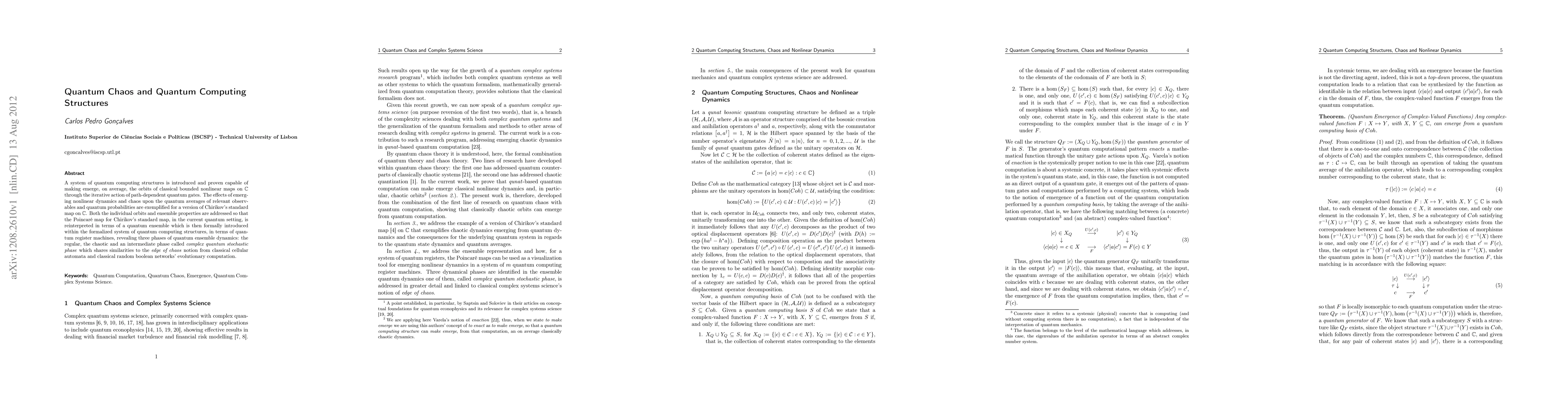 A system of quantum computing structures is introduced and proven capable of making emerge, on average, the orbits of classical bounded nonlinear maps on \mathbb{C} through the iterative action of path-dependent quantum gates. The effects of emerging nonlinear dynamics and chaos upon the quantum averages of relevant observables and quantum probabilities are exemplified for a version of Chirikov's standard map on \mathbb{C} . Both the individual orbits and ensemble properties are addressed so that the Poincar\'e map for Chirikov's standard map, in the current quantum setting, is reinterpreted in terms of a quantum ensemble which is then formally introduced within the formalized system of quantum computing structures, in terms of quantum register machines, revealing three phases of quantum ensemble dynamics: the regular, the chaotic and an intermediate phase called complex quantum stochastic phase which shares similarities to the edge of chaos notion from classical cellular automata and classical random boolean networks' evolutionary computation.