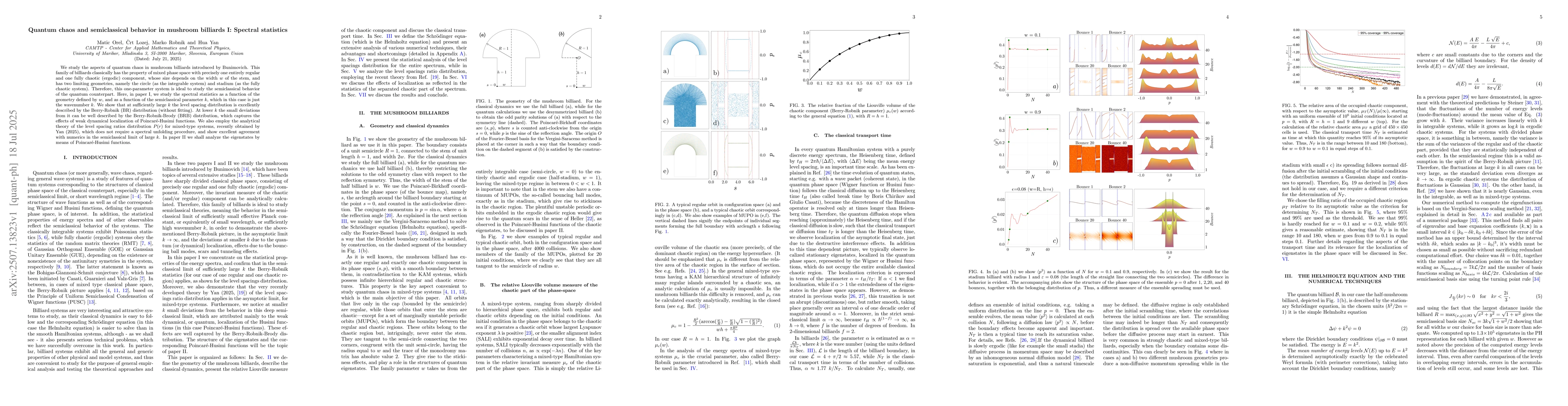 We study the aspects of quantum chaos in mushroom billiards introduced by Bunimovich. This family of billiards classically has the property of mixed phase space with precisely one entirely regular and one fully chaotic (ergodic) component, whose size depends on the width w of the stem, and has two limiting geometries, namely the circle (as the integrable system) and stadium (as the fully chaotic system). Therefore, this one-parameter system is ideal to study the semiclassical behavior of the quantum counterpart. Here, in paper I, we study the spectral statistics as a function of the geometry defined by w, and as a function of the semiclassical parameter k, which in this case is just the wavenumber k. We show that at sufficiently large k the level spacing distribution is excellently described by the Berry-Robnik (BR) distribution (without fitting). At lower k the small deviations from it can be well described by the Berry-Robnik-Brody (BRB) distribution, which captures the effects of weak dynamical localization of Poincar\'e-Husimi functions. We also employ the analytical theory of the level spacing ratios distribution P(r) for mixed-type systems, recently obtained by Yan (2025), which does not require a spectral unfolding procedure, and show excellent agreement with numerics in the semiclassical limit of large k. In paper II we shall analyze the eigenstates by means of Poincar\'e-Husimi functions.