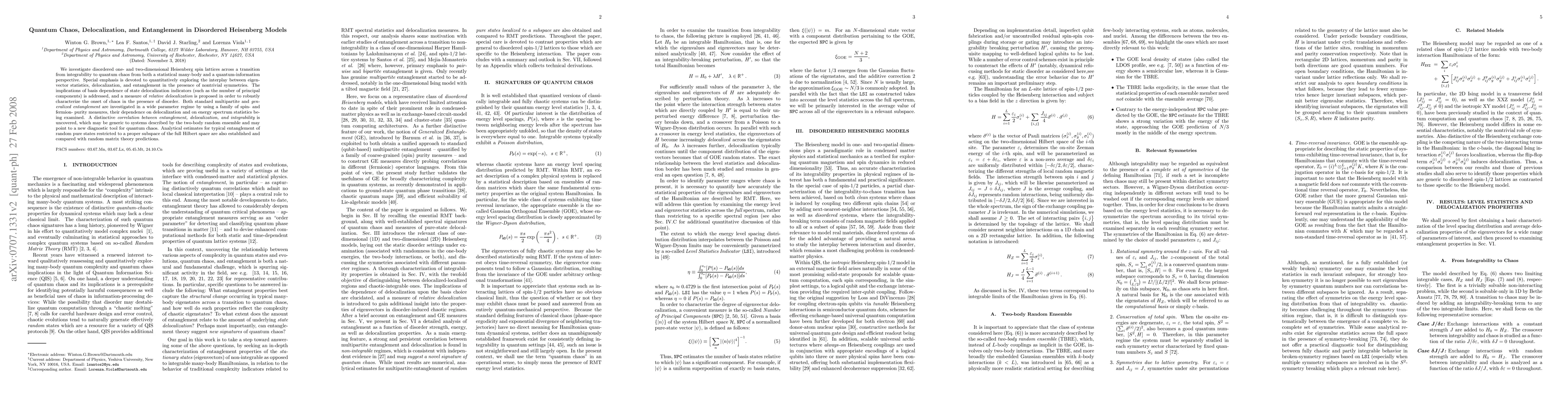 This paper explores the transition from integrability to quantum chaos in disordered Heisenberg spin models, focusing on the interplay between eigenvector statistics, delocalization, and entanglement. A new measure of relative delocalization is proposed to characterize chaos onset, revealing a correlation between entanglement, delocalization, and integrability that may serve as a diagnostic tool for quantum chaos.