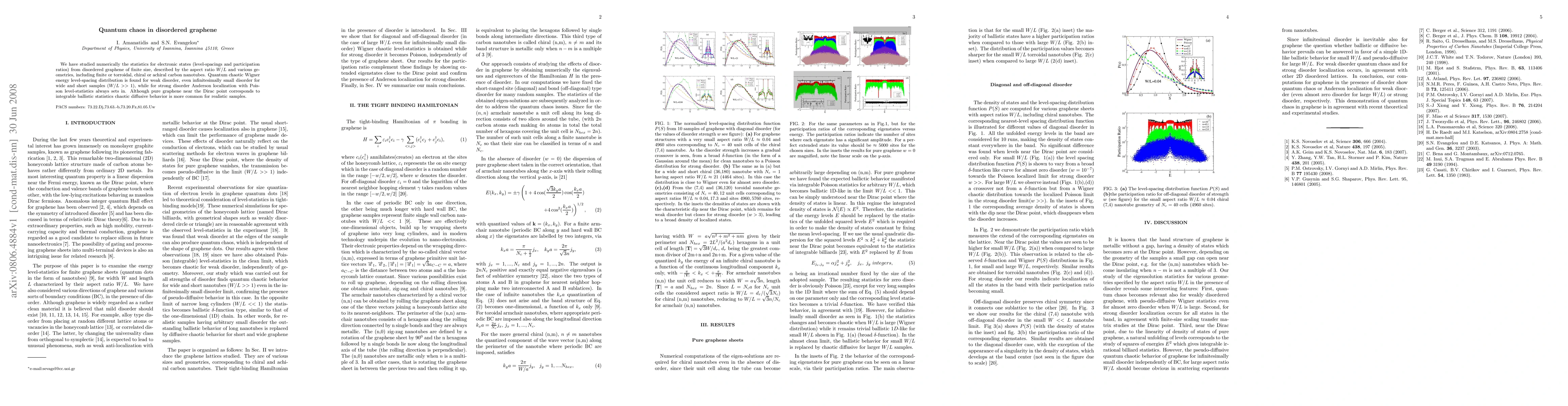 We have studied numerically the statistics for electronic states (level-spacings and participation ratios) from disordered graphene of finite size, described by the aspect ratio $W/L$ and various geometries, including finite or torroidal, chiral or achiral carbon nanotubes. Quantum chaotic Wigner energy level-spacing distribution is found for weak disorder, even infinitesimally small disorder for wide and short samples ($W/L>>1$), while for strong disorder Anderson localization with Poisson level-statistics always sets in. Although pure graphene near the Dirac point corresponds to integrable ballistic statistics chaotic diffusive behavior is more common for realistic samples.