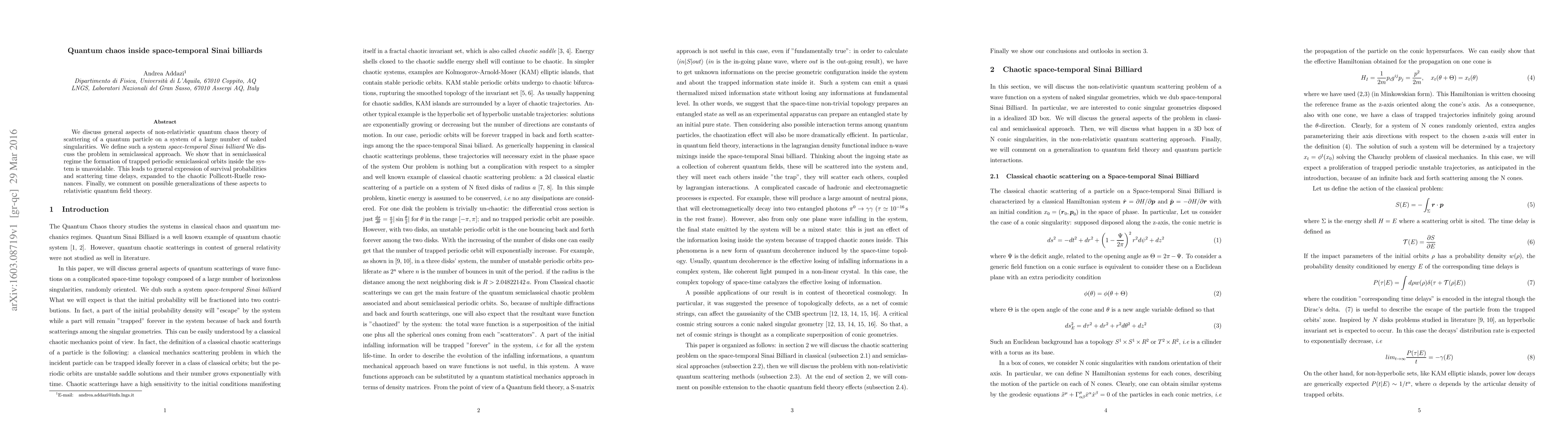 We discuss general aspects of non-relativistic quantum chaos theory of scattering of a quantum particle on a system of a large number of naked singularities. We define such a system space-temporal Sinai billiard We dis- cuss the problem in semiclassical approach. We show that in semiclassical regime the formation of trapped periodic semiclassical orbits inside the sys- tem is unavoidable. This leads to general expression of survival probabilities and scattering time delays, expanded to the chaotic Pollicott-Ruelle reso- nances. Finally, we comment on possible generalizations of these aspects to relativistic quantum field theory.