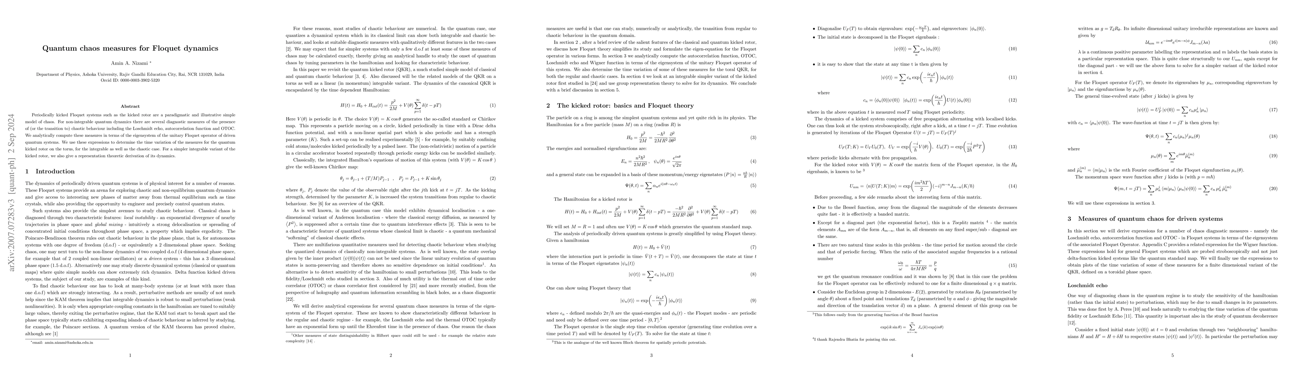 Periodically kicked Floquet systems such as the kicked rotor are a paradigmatic and illustrative simple model of chaos. For non-integrable quantum dynamics there are several diagnostic measures of the presence of (or the transition to) chaotic behaviour including the Loschmidt echo, Wigner function, spectral function and OTOC. We analytically compute these measures in terms of the eigensystem of the unitary Floquet operator of driven quantum systems. We also determine equivalent alternative forms of the eigen-equation of the Floquet operator for the quantum kicked rotor. For a simpler integrable variant of the kicked rotor, we give a representation theoretic derivation of its dynamics.