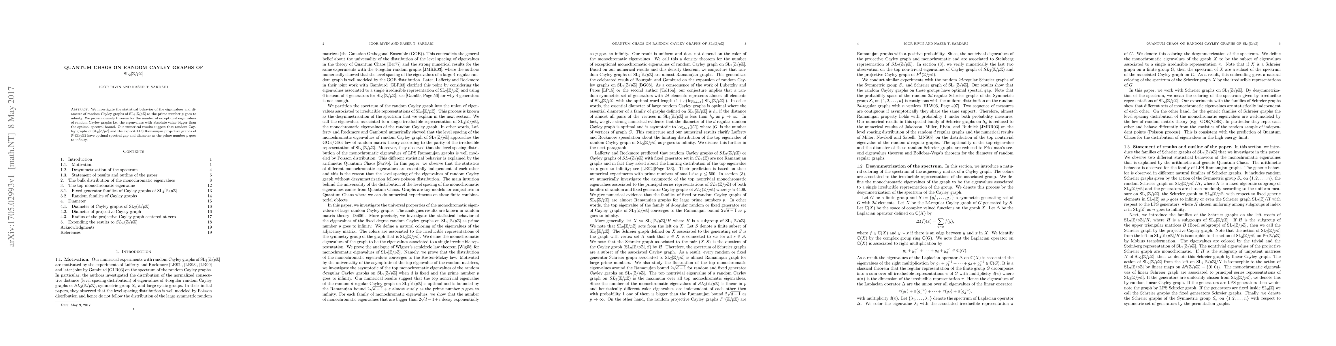 We investigate the statistical behavior of the eigenvalues and diameter of random Cayley graphs of ${\rm SL}_2[\mathbb{Z}/p\mathbb{Z}]$ %and the Symmetric group $S_n$ as the prime number $p$ goes to infinity. We prove a density theorem for the number of exceptional eigenvalues of random Cayley graphs i.e. the eigenvalues with absolute value bigger than the optimal spectral bound. Our numerical results suggest that random Cayley graphs of ${\rm SL}_2[\mathbb{Z}/p\mathbb{Z}]$ and the explicit LPS Ramanujan projective graphs of $\mathbb{P}^1(\mathbb{Z}/p\mathbb{Z})$ have optimal spectral gap and diameter as the prime number $p$ goes to infinity.