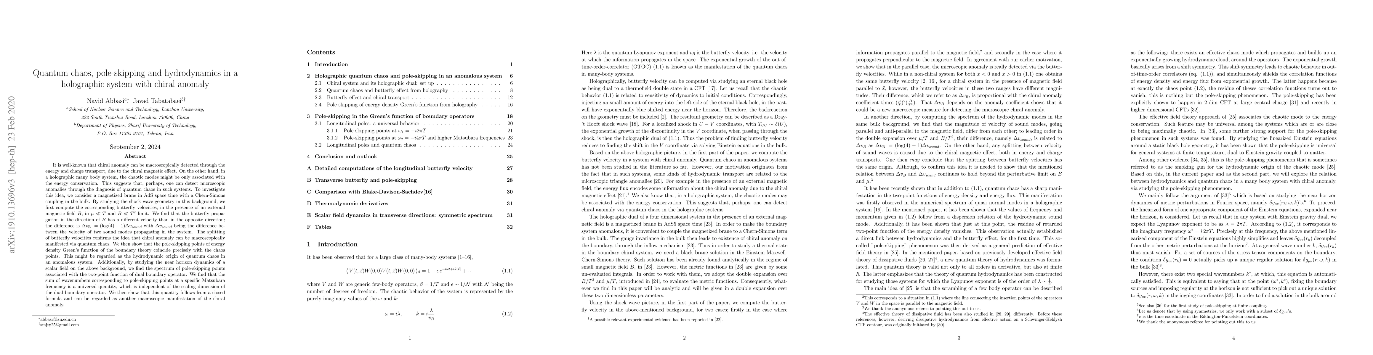 It is well-known that chiral anomaly can be macroscopically detected through the energy and charge transport, due to the chiral magnetic effect. On the other hand, in a holographic many body system, the chaotic modes might be only associated with the energy conservation. This suggests that, perhaps, one can detect microscopic anomalies through the diagnosis of quantum chaos in such systems. To investigate this idea, we consider a magnetized brane in AdS space time with a Chern-Simons coupling in the bulk. By studying the shock wave geometry in this background, we first compute the corresponding butterfly velocities, in the presence of an external magnetic field $B$, in $\mu\ll T$ and $ B \ll T^2$ limit. We find that the butterfly propagation in the direction of $B$ has a different velocity than in the opposite direction. The splitting of butterfly velocities confirms the idea that chiral anomaly can be macroscopically manifested via quantum chaos. We then show that the pole-skipping points of energy density Green's function of the boundary theory coincide precisely with the chaos points. This might be regarded as the hydrodynamic origin of quantum chaos in an anomalous system. Additionally, by studying the near horizon dynamics of a scalar field on the above background, we find the spectrum of pole-skipping points associated with the two-point function of dual boundary operator. We find that the sum of wavenumbers corresponding to pole-skipping points at a specific Matsubara frequency is a universal quantity, which is independent of the scaling dimension of the dual boundary operator. We then show that this quantity follows from a closed formula and can be regarded as another macroscopic manifestation of the chiral anomaly.