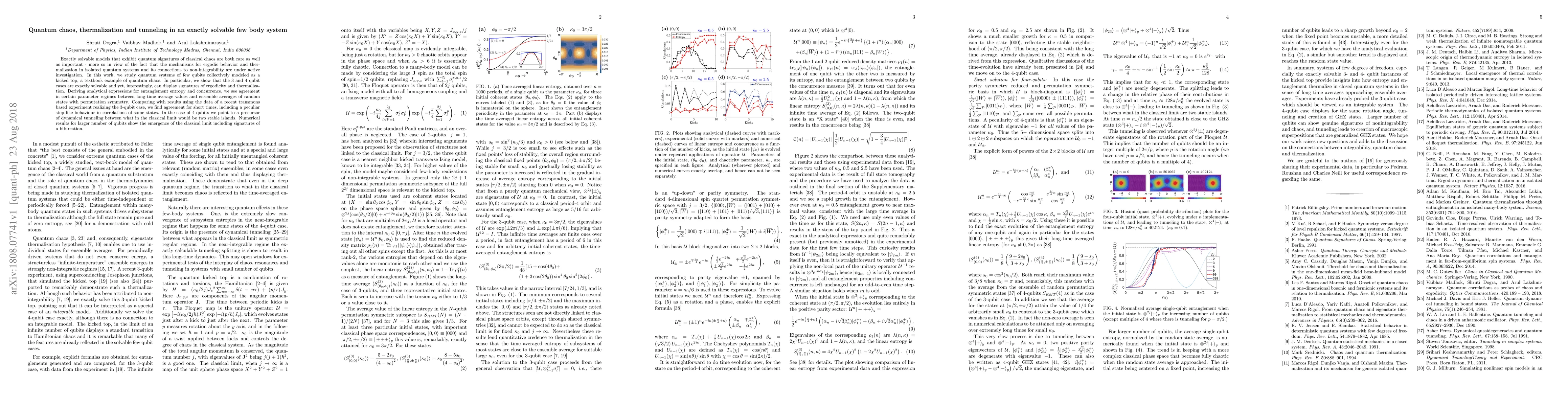 This paper investigates quantum chaos in exactly solvable few-qubit systems modeled as a kicked top, demonstrating ergodic behavior and thermalization. Analytical results for entanglement entropy and concurrence show agreement with experimental data for short times, and hint at dynamical tunneling in the 4-qubit case.