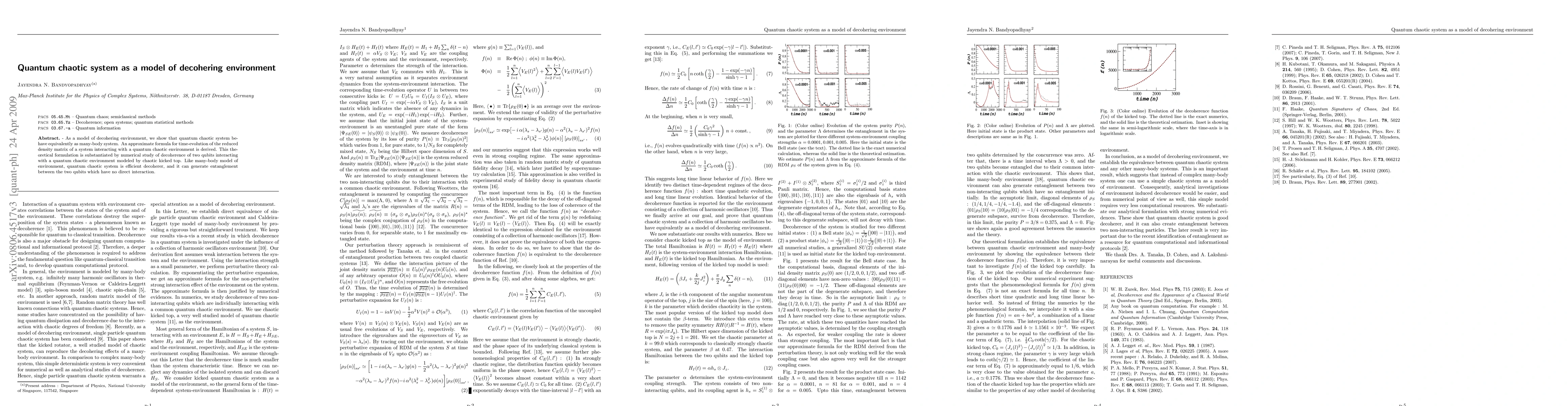 This paper proposes a quantum chaotic system as a model for a decohering environment, demonstrating its equivalence to many-body systems in terms of decoherence. It derives an approximate formula for the time evolution of the reduced density matrix and supports the theory with numerical studies of two qubits interacting with a chaotic kicked top environment.