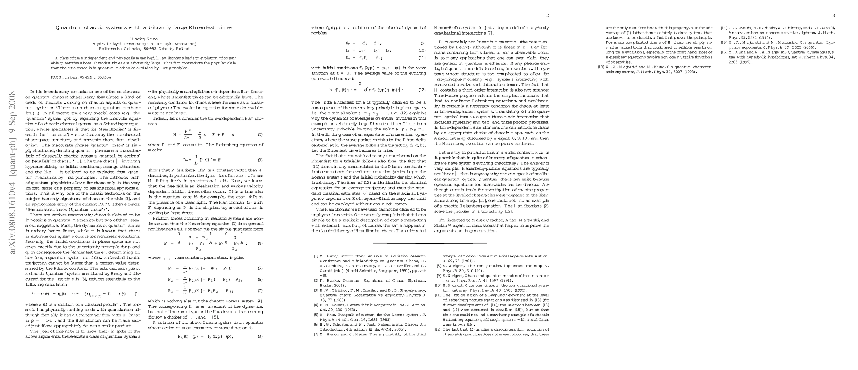 A class of time independent and physically meaningful Hamiltonians leads to evolution of observable quantities whose Ehrenfest times are arbitrarily large. This fact contradicts the popular claim that the true chaos is in quantum mechanics excluded by first principles.