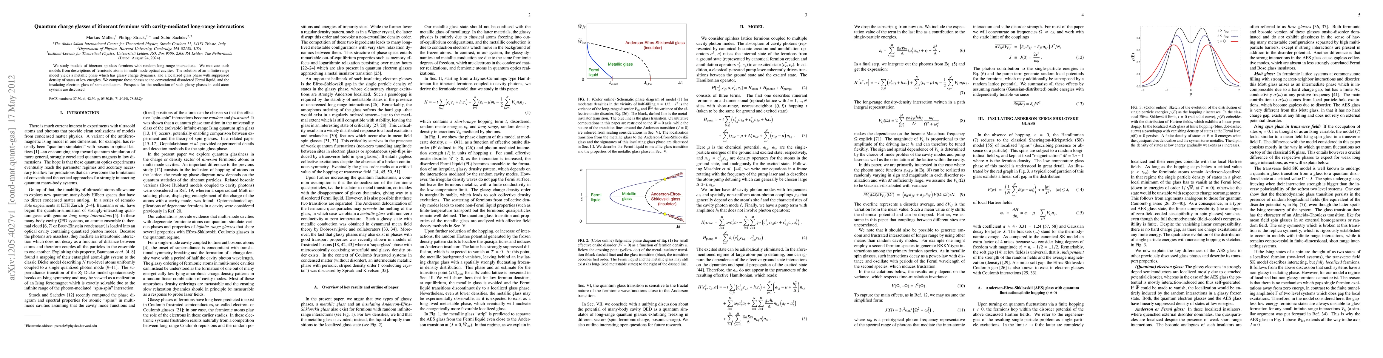 This paper investigates itinerant spinless fermions with random long-range interactions, motivated by fermionic atoms in optical cavities, revealing metallic and localized glass phases with unique charge dynamics, and compares these to conventional disordered Fermi liquid and semiconductor electron glass. The study discusses potential cold atom system implementations.