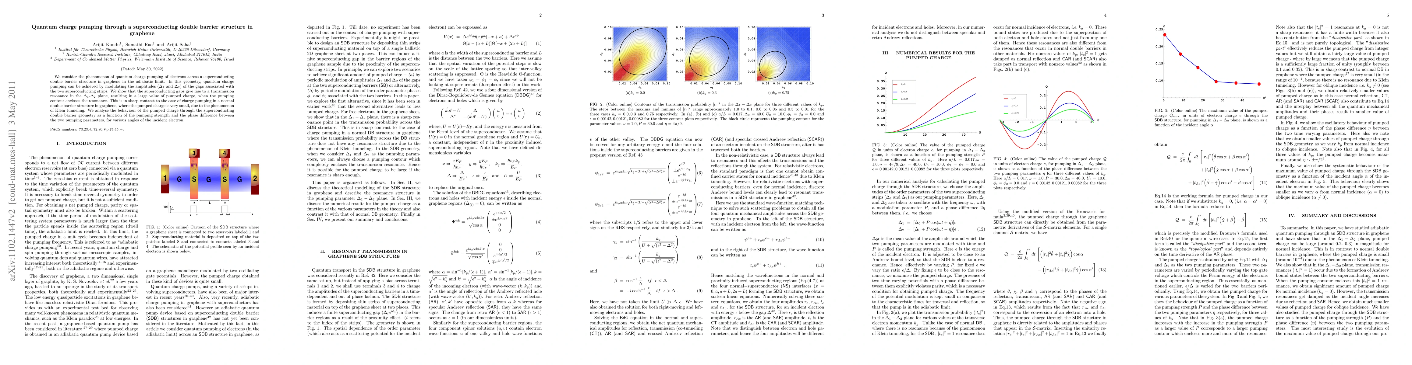 This paper investigates quantum charge pumping in a graphene structure with two superconducting barriers, demonstrating that modulating the superconducting gap amplitudes can lead to a significant pumped charge due to transmission resonance, contrasting sharply with normal double barrier scenarios where Klein tunneling limits charge pumping. The study analyzes the pumped charge's dependence on pumping strength and phase difference.