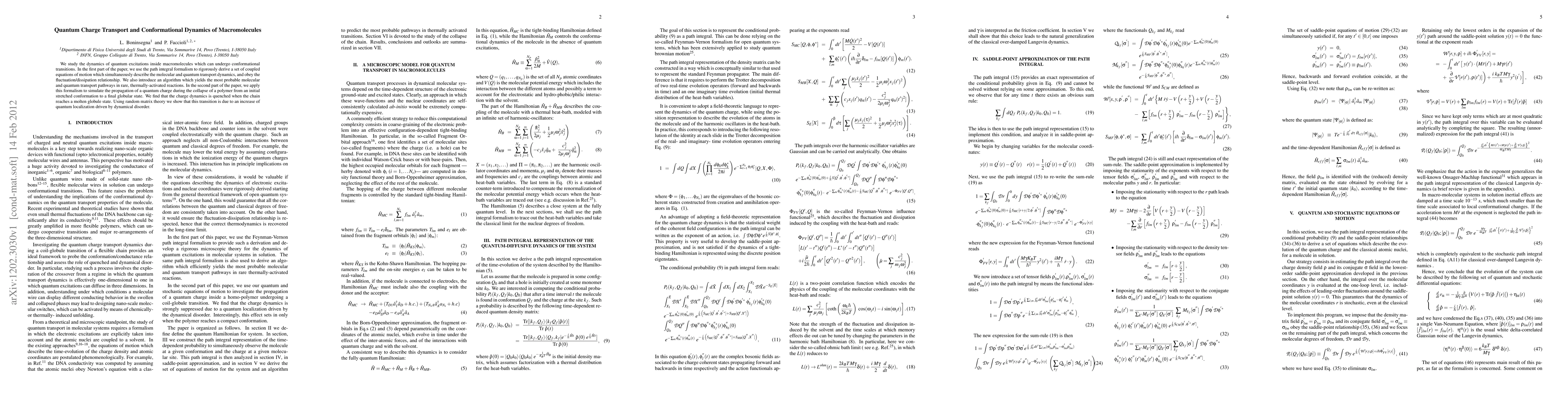 We study the dynamics of quantum excitations inside macromolecules which can undergo conformational transitions. In the first part of the paper, we use the path integral formalism to rigorously derive a set of coupled equations of motion which simultaneously describe the molecular and quantum transport dynamics, and obey the fluctuation/dissipation relationship. We also introduce an algorithm which yields the most probable molecular and quantum transport pathways in rare, thermally-activated reactions. In the second part of the paper, we apply this formalism to simulate the propagation of a charge during the collapse of a polymer from an initial stretched conformation to a final globular state. We find that the charge dynamics is quenched when the chain reaches a molten globule state. Using random matrix theory we show that this transition is due to an increase of quantum localization driven by dynamical disorder.
