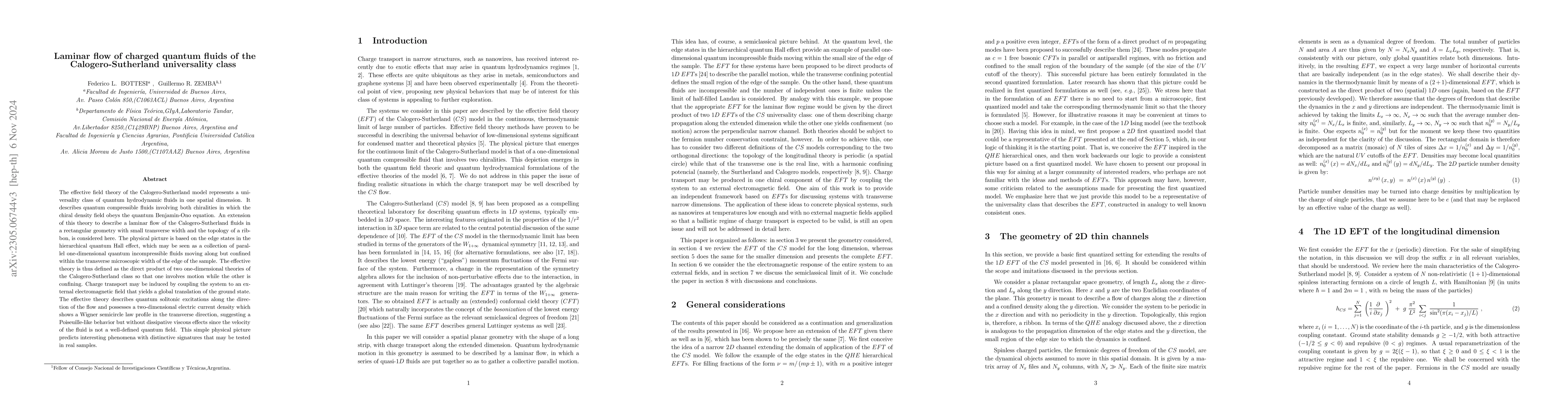We consider the transport of spinless fermion charge carriers in a planar narrow rectangular geometry, with the larger dimension being periodic and the narrow one confined to a finite strip width, and ballistic flow in the larger dimension only. Our analysis is based on the formulation of an Effective Field Theory (EFT) for the system, which is appropriate for discussing universal phenomena. The EFT is constructed as a direct product of two known one-dimensional ones obtained both from the thermodynamic limit of the Calogero-Sutherland model. This lower dimensional EFT is known to be capable of describing a quantum hydrodynamical flow. The resulting two-dimensional EFT displays a ground state charge density that is constant along the large dimension and vanishes at the boundaries of the narrow one with the shape of a semi-circumference. This latter feature is a consequence of the specific harmonic confining potential in the narrow dimension considered. The charge transport is obtained by coupling the system to an external electromagnetic field that induces a global translation. The EFT incorporates quantum solitonic excitations along the direction of the flow and the two-dimensional electric current density shows a Poiseuille-like behavior, indicating the presence of non-dissipative quantum viscous effects in the direction transverse to the flow. These two are among the most interesting features while discussing and observing charge flow in nanoscopic structures of several types. We provide explicit expressions for the electric current intensity, DC resistivity and charge mobility in an example.
