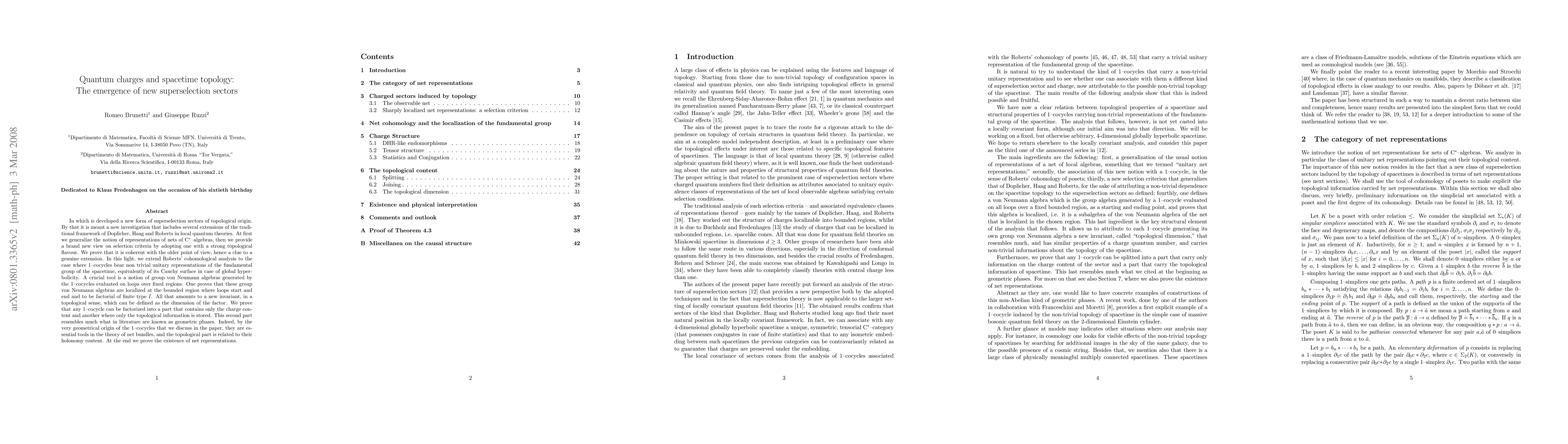 In which is developed a new form of superselection sectors of topological origin. By that it is meant a new investigation that includes several extensions of the traditional framework of Doplicher, Haag and Roberts in local quantum theories. At first we generalize the notion of representations of nets of C*-algebras, then we provide a brand new view on selection criteria by adopting one with a strong topological flavour. We prove that it is coherent with the older point of view, hence a clue to a genuine extension. In this light, we extend Roberts' cohomological analysis to the case where 1--cocycles bear non trivial unitary representations of the fundamental group of the spacetime, equivalently of its Cauchy surface in case of global hyperbolicity. A crucial tool is a notion of group von Neumann algebras generated by the 1-cocycles evaluated on loops over fixed regions. One proves that these group von Neumann algebras are localized at the bounded region where loops start and end and to be factorial of finite type I. All that amounts to a new invariant, in a topological sense, which can be defined as the dimension of the factor. We prove that any 1-cocycle can be factorized into a part that contains only the charge content and another where only the topological information is stored. This second part resembles much what in literature are known as geometric phases. Indeed, by the very geometrical origin of the 1-cocycles that we discuss in the paper, they are essential tools in the theory of net bundles, and the topological part is related to their holonomy content. At the end we prove the existence of net representations.