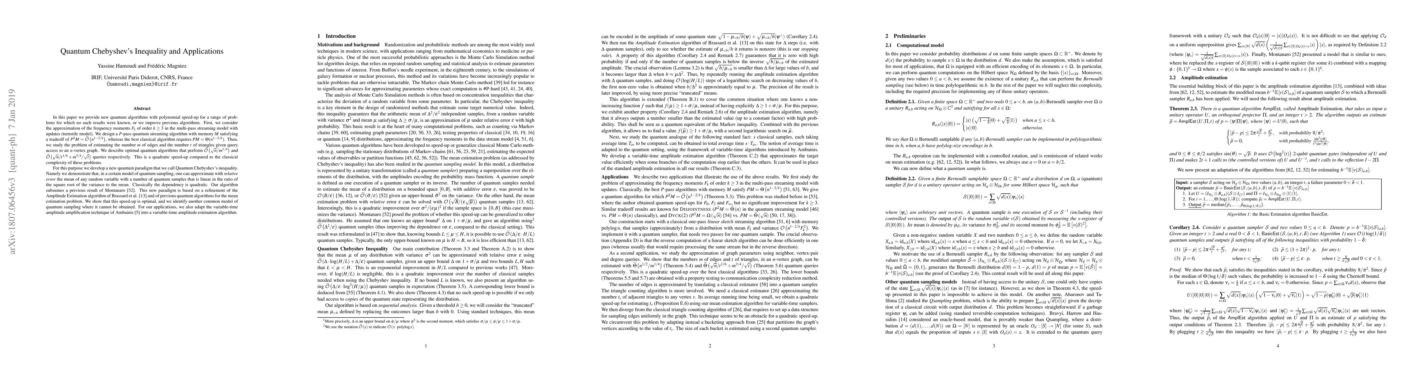 In this paper we provide new quantum algorithms with polynomial speed-up for a range of problems for which no such results were known, or we improve previous algorithms. First, we consider the approximation of the frequency moments $F_k$ of order $k \geq 3$ in the multi-pass streaming model with updates (turnstile model). We design a $P$-pass quantum streaming algorithm with memory $M$ satisfying a tradeoff of $P^2 M = \tilde{O}(n^{1-2/k})$, whereas the best classical algorithm requires $P M = \Theta(n^{1-2/k})$. Then, we study the problem of estimating the number $m$ of edges and the number $t$ of triangles given query access to an $n$-vertex graph. We describe optimal quantum algorithms that perform $\tilde{O}(\sqrt{n}/m^{1/4})$ and $\tilde{O}(\sqrt{n}/t^{1/6} + m^{3/4}/\sqrt{t})$ queries respectively. This is a quadratic speed-up compared to the classical complexity of these problems. For this purpose we develop a new quantum paradigm that we call Quantum Chebyshev's inequality. Namely we demonstrate that, in a certain model of quantum sampling, one can approximate with relative error the mean of any random variable with a number of quantum samples that is linear in the ratio of the square root of the variance to the mean. Classically the dependency is quadratic. Our algorithm subsumes a previous result of Montanaro [Mon15]. This new paradigm is based on a refinement of the Amplitude Estimation algorithm of Brassard et al. [BHMT02] and of previous quantum algorithms for the mean estimation problem. We show that this speed-up is optimal, and we identify another common model of quantum sampling where it cannot be obtained. For our applications, we also adapt the variable-time amplitude amplification technique of Ambainis [Amb10] into a variable-time amplitude estimation algorithm.