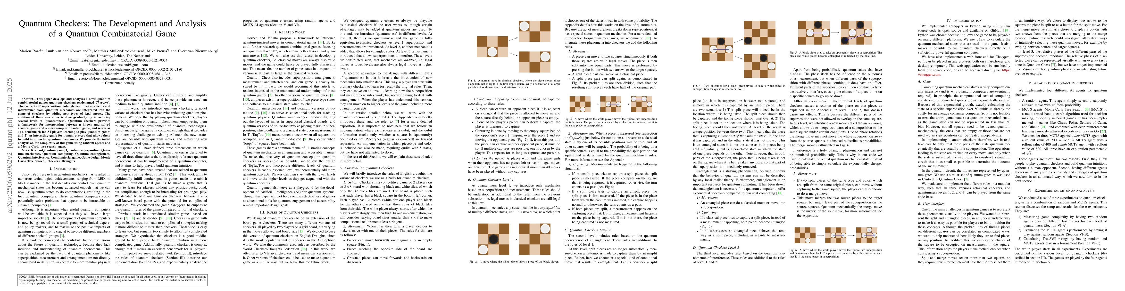 A new quantum combinatorial game called Quantum Checkers is developed, integrating quantum mechanics concepts into the classic game of checkers, serving as a benchmark for AI players and an educational tool for human players.