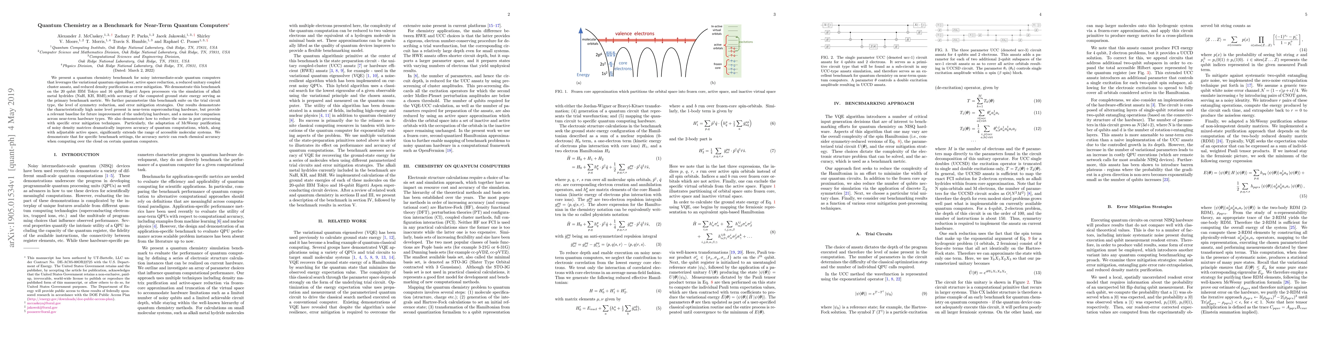 This paper introduces a quantum chemistry benchmark for noisy intermediate-scale quantum computers, utilizing variational quantum eigensolver and error mitigation techniques to simulate alkali metal hydrides. It highlights the significant noise in current hardware but shows potential for future improvements and accuracy, reaching chemical accuracy under certain conditions.
