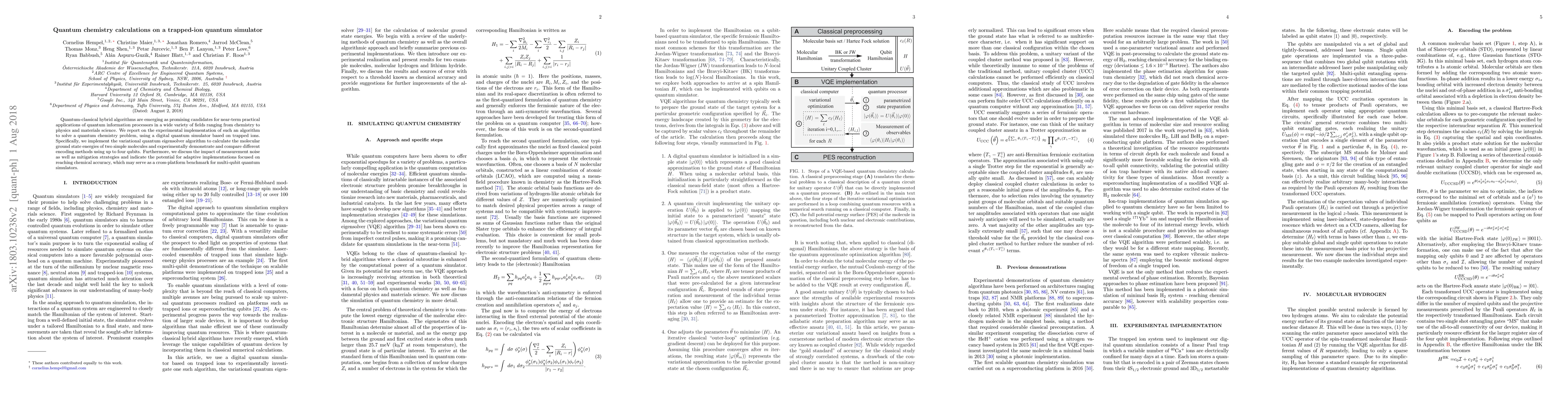 This paper details the experimental implementation of a variational quantum eigensolver algorithm on a trapped-ion quantum simulator to calculate ground state energies for simple molecules, comparing various encoding methods and discussing noise mitigation strategies to achieve chemical accuracy. The study serves as a benchmark for multi-qubit quantum simulators.