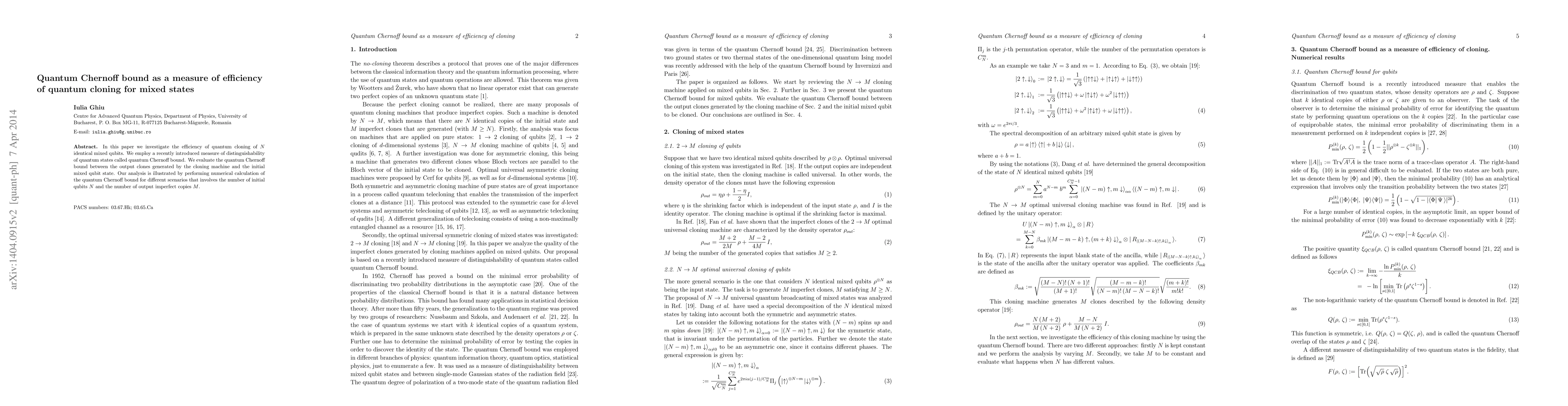 This paper evaluates the efficiency of quantum cloning for mixed qubit states using the quantum Chernoff bound, a measure of distinguishability, and performs numerical calculations to analyze the output clones against the initial state for various qubit and copy numbers.