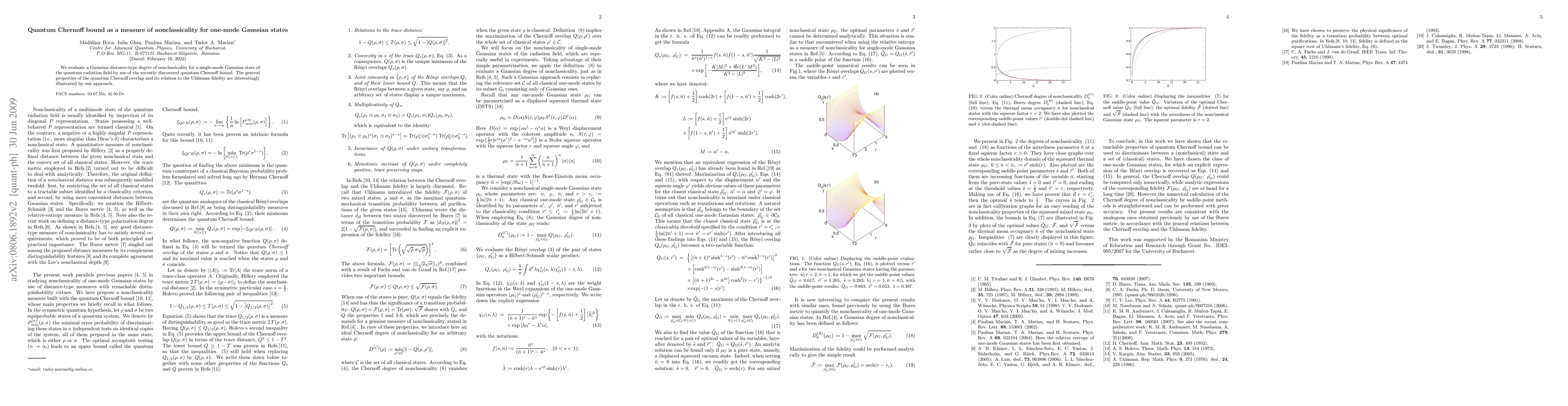 We evaluate a Gaussian distance-type degree of nonclassicality for a single-mode Gaussian state of the quantum radiation field by use of the recently discovered quantum Chernoff bound. The general properties of the quantum Chernoff overlap and its relation to the Uhlmann fidelity are interestingly illustrated by our approach.