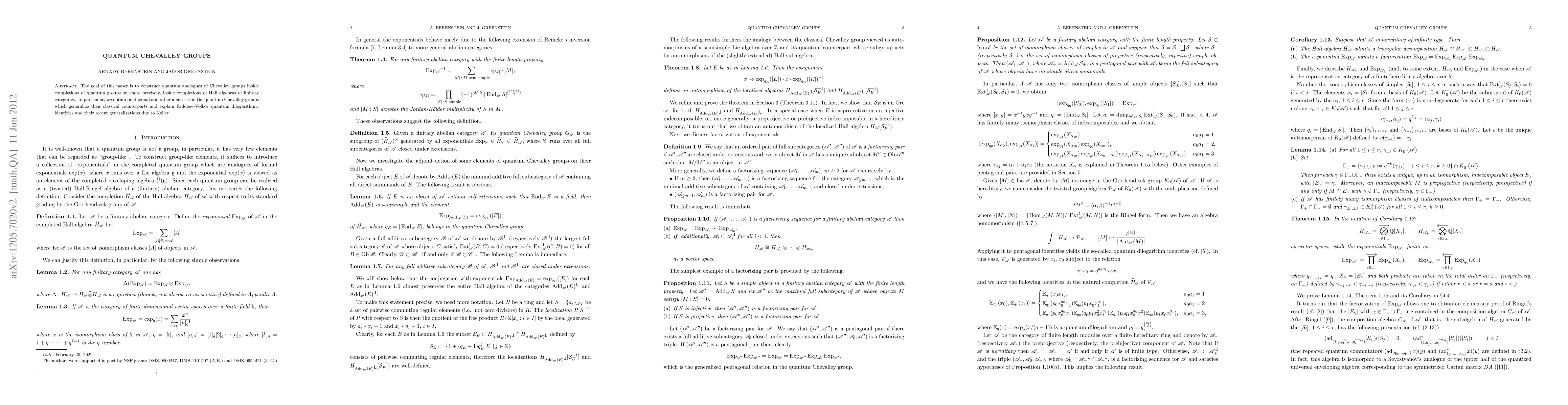 The goal of this paper is to construct quantum analogues of Chevalley groups inside completions of quantum groups or, more precisely, inside completions of Hall algebras of finitary categories. In particular, we obtain pentagonal and other identities in the quantum Chevalley groups which generalize their classical counterparts and explain Faddeev-Volkov quantum dilogarithmic identities and their recent generalizations due to Keller