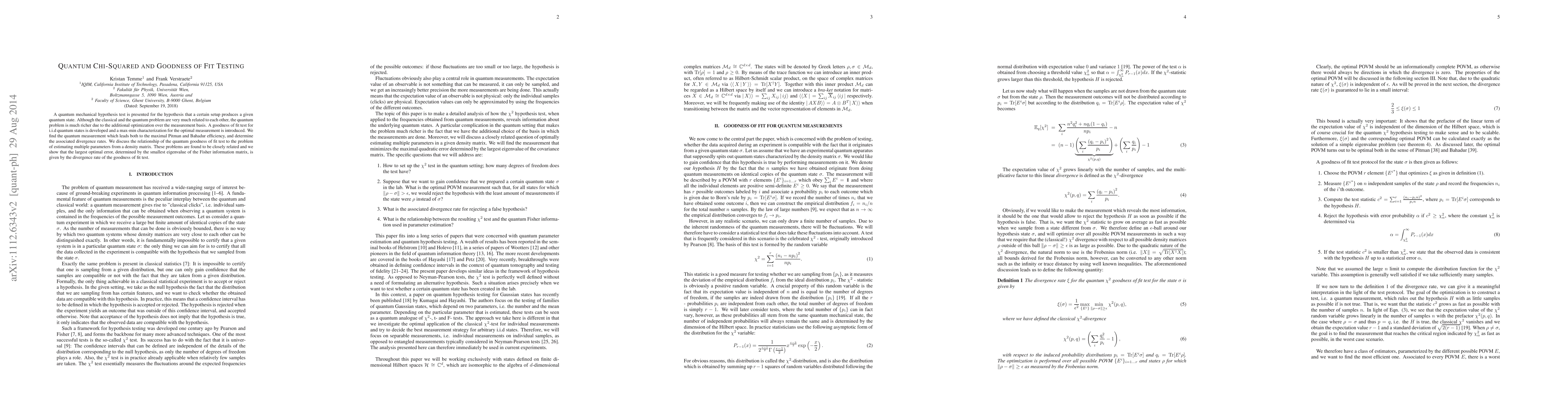 The density matrix in quantum mechanics parameterizes the statistical properties of the system under observation, just like a classical probability distribution does for classical systems. The expectation value of observables cannot be measured directly, it can only be approximated by applying classical statistical methods to the frequencies by which certain measurement outcomes (clicks) are obtained. In this paper, we make a detailed study of the statistical fluctuations obtained during an experiment in which a hypothesis is tested, i.e. the hypothesis that a certain setup produces a given quantum state. Although the classical and quantum problem are very much related to each other, the quantum problem is much richer due to the additional optimization over the measurement basis. Just as in the case of classical hypothesis testing, the confidence in quantum hypothesis testing scales exponentially in the number of copies. In this paper, we will argue 1) that the physically relevant data of quantum experiments is only contained in the frequencies of the measurement outcomes, and that the statistical fluctuations of the experiment are essential, so that the correct formulation of the conclusions of a quantum experiment should be given in terms of hypothesis tests, 2) that the (classical) $\chi^2$ test for distinguishing two quantum states gives rise to the quantum $\chi^2$ divergence when optimized over the measurement basis, 3) present a max-min characterization for the optimal measurement basis for quantum goodness of fit testing, find the quantum measurement which leads both to the maximal Pitman and Bahadur efficiency, and determine the associated divergence rates.