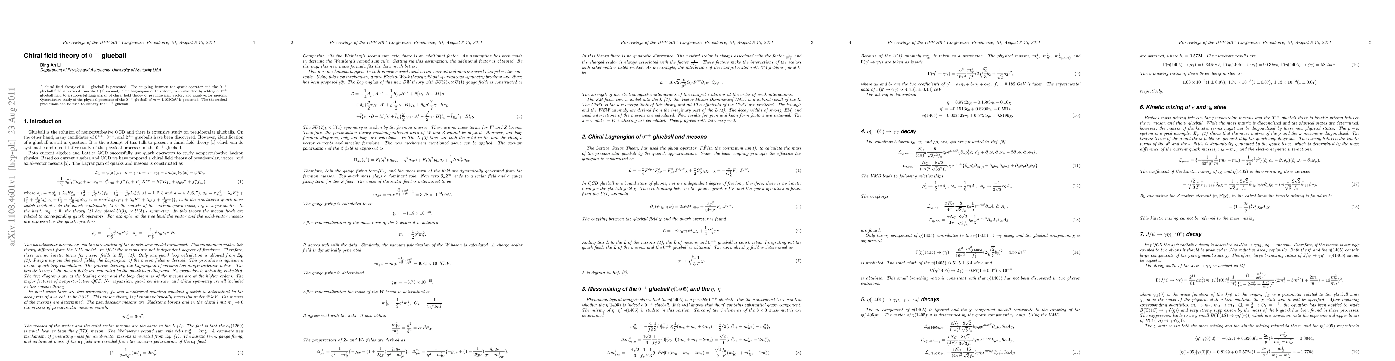 A chiral field theory of $0^{-+}$ glueball is presented. The coupling between the quark operator and the $0^{-+}$ glueball field is revealed from the U(1) anomaly. The Lagrangian of this theory is constructed by adding a $0^{-+}$ glueball field to a successful Lagrangian of chiral field theory of pseudoscalar, vector, and axial-vector mesons. Quantitative study of the physical processes of the $0^{-+}$ glueball of $m=1.405\textrm{GeV}$ is presented. The theoretical predictions can be used to identify the $0^{-+}$ glueball.