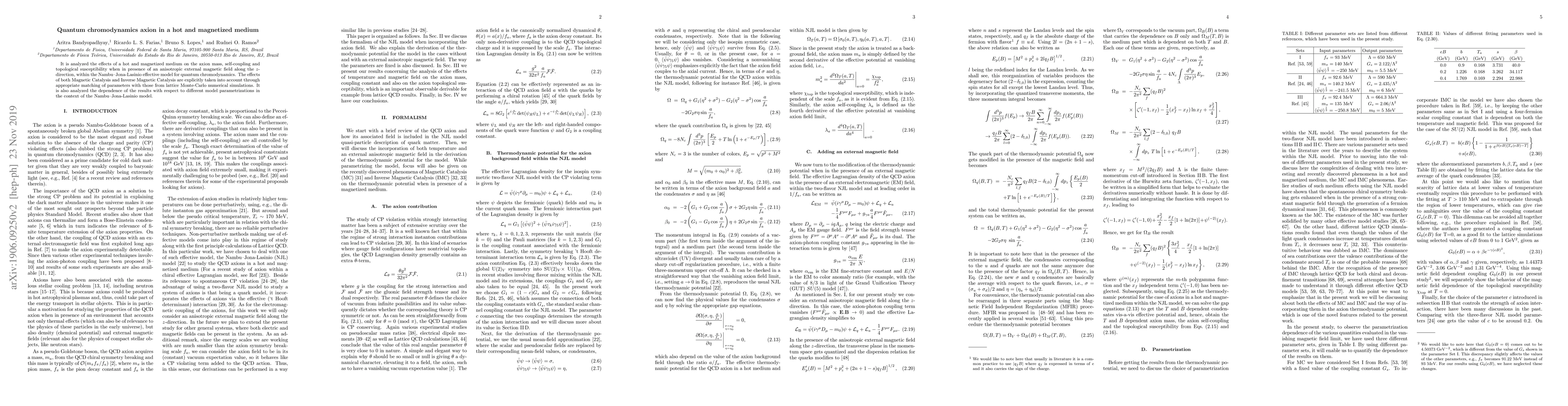 It is analyzed the effects of a hot and magnetized medium on the axion mass, self-coupling and topological susceptibility when in presence of an anisotropic external magnetic field along the $z$-direction, within the Nambu--Jona-Lasinio effective model for quantum chromodynamics. The effects of both Magnetic Catalysis and Inverse Magnetic Catalysis are explicitly taken into account through appropriate matching of parameters with those from lattice Monte-Carlo numerical simulations. It is also analyzed the dependence of the results with respect to different model parametrizations in the context of the Nambu--Jona-Lasinio model.