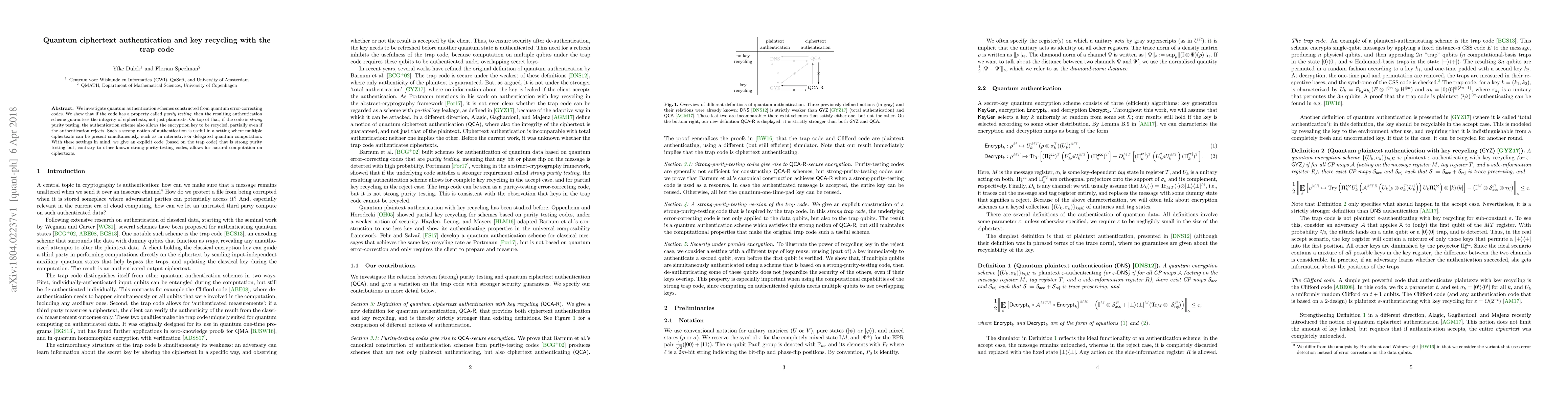 This paper explores quantum authentication schemes based on quantum error-correcting codes, demonstrating that codes with purity testing can secure ciphertexts' integrity. It also introduces a trap code that enables key recycling even when authentication fails, facilitating efficient computation in interactive or delegated quantum settings.