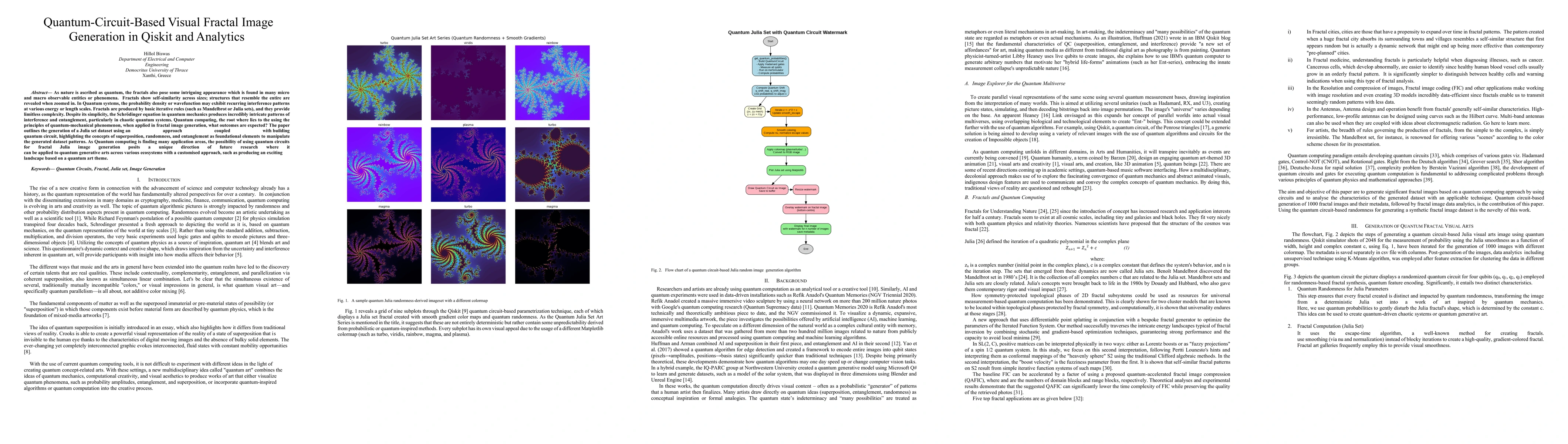 As nature is ascribed as quantum, the fractals also pose some intriguing appearance which is found in many micro and macro observable entities or phenomena. Fractals show self-similarity across sizes; structures that resemble the entire are revealed when zoomed in. In Quantum systems, the probability density or wavefunction may exhibit recurring interference patterns at various energy or length scales. Fractals are produced by basic iterative rules (such as Mandelbrot or Julia sets), and they provide limitless complexity. Despite its simplicity, the Schr\"odinger equation in quantum mechanics produces incredibly intricate patterns of interference and entanglement, particularly in chaotic quantum systems. Quantum computing, the root where lies to the using the principles of quantum-mechanical phenomenon, when applied in fractal image generation, what outcomes are expected? The paper outlines the generation of a Julia set dataset using an approach coupled with building quantum circuit, highlighting the concepts of superposition, randomness, and entanglement as foundational elements to manipulate the generated dataset patterns. As Quantum computing is finding many application areas, the possibility of using quantum circuits for fractal Julia image generation posits a unique direction of future research where it can be applied to quantum generative arts across various ecosystems with a customised approach, such as producing an exciting landscape based on a quantum art theme.