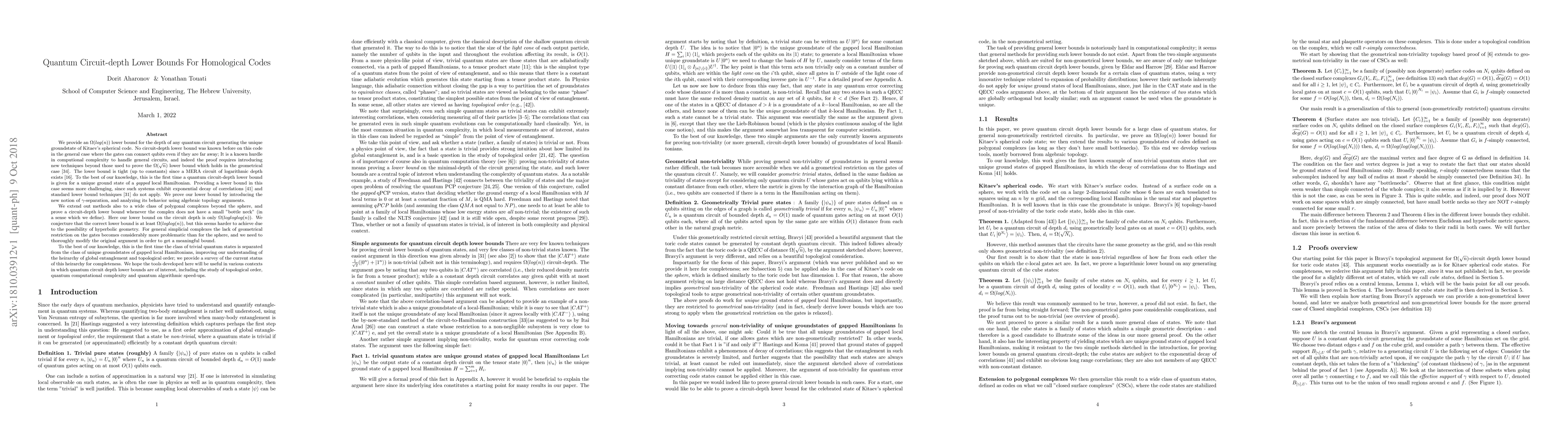We provide an $\Omega(log(n))$ lower bound for the depth of any quantum circuit generating the unique groundstate of Kitaev's spherical code. No circuit-depth lower bound was known before on this code in the general case where the gates can connect qubits even if they are far away; To the best of our knowledge, this is the first time a quantum circuit-depth lower bound is given for unique ground state of a {\it gapped} local Hamiltonian. Providing a lower bound in this case seems more challenging, since such systems exhibit exponential decay of correlations and standard lower bound techniques do not apply. We prove our lower bound by introducing the new notion of $\gamma$-separation, and analyzing its behavior using algebraic topology arguments. We extend out methods also to a wide class of polygonal complexes beyond the sphere, and prove a circuit-depth lower bound whenever the complex does not have a small "bottle neck" (in a sense which we define). Here our lower bound on the circuit depth is only $\Omega(logloglog(n))$. We conjecture that the correct lower bound is at least $\Omega(log(log(n))$, but this seems harder to achieve due to the possibility of hyperbolic geometry. For general simplicial complexes the lack of geometrical restriction on the gates becomes considerably more problematic than for the sphere, and we need to thoroughly modify the original argument in order to get a meaningful bound. To the best of our knowledge, this is the first time the class of trivial quantum states is separated from the class of unique ground states of gapped local Hamiltonians; we provide a survey of the current status of this hierarchy for completeness.The tools developed here will be useful in various contexts in which quantum circuit depth lower bounds are of interest, including the study of topological order, quantum computational complexity and quantum algorithmic speedups.