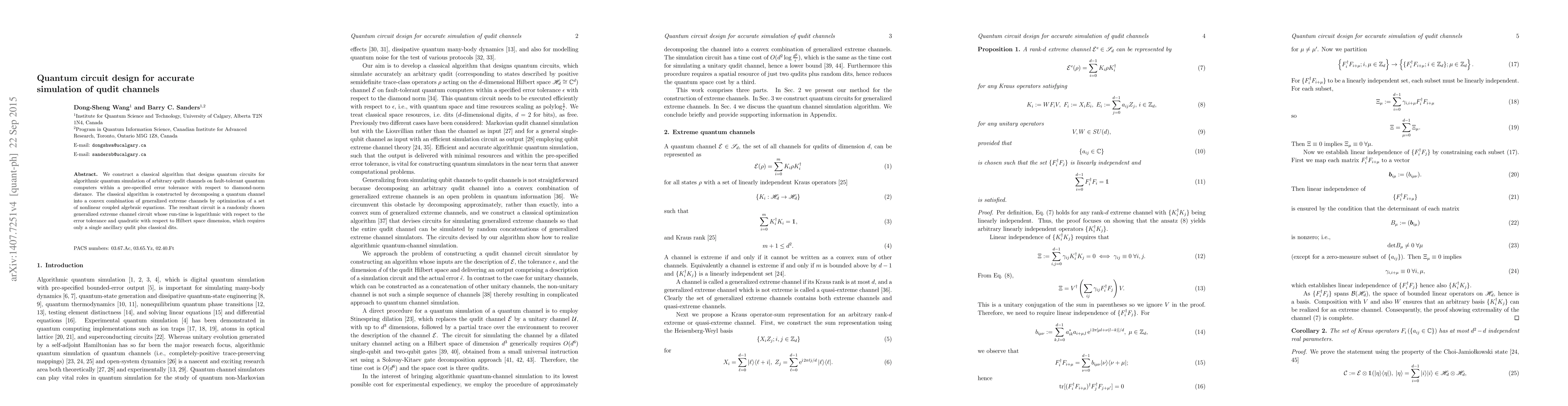 This paper presents a classical algorithm for designing quantum circuits to simulate arbitrary qudit channels on fault-tolerant quantum computers with a specified error tolerance. The algorithm decomposes channels into generalized extreme channels and optimizes a set of nonlinear equations to achieve the desired simulation accuracy.